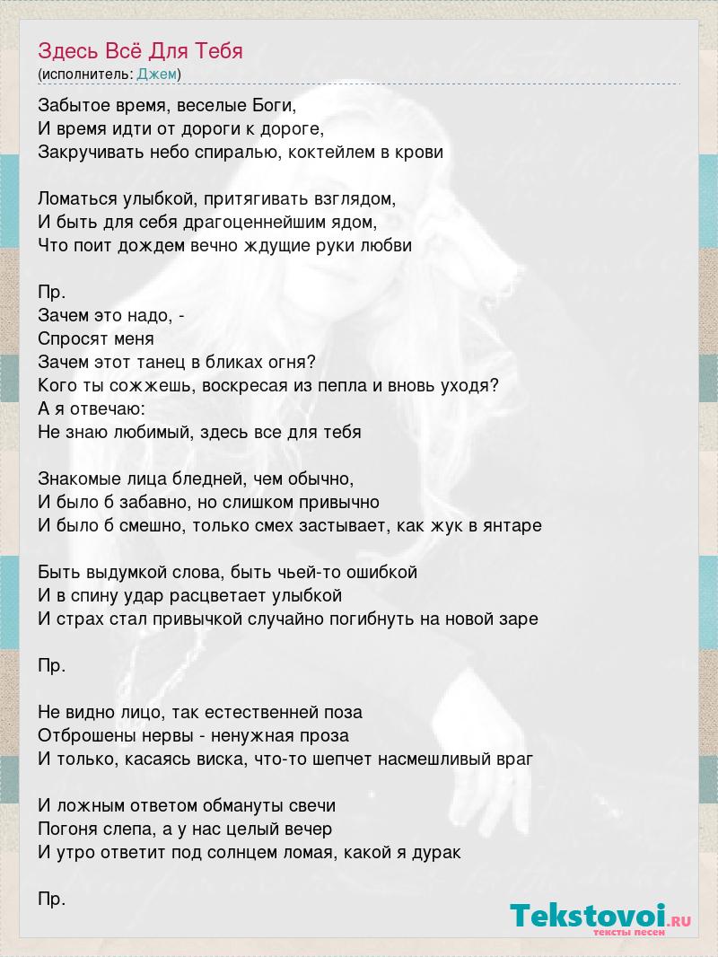 Забытое время, веселые Боги, И время идти от дороги к дороге, Закручивать небо спиралью, коктейлем в крови Ломаться улыбкой, притягивать взглядом, И быть для себя драгоценнейшим ядом, Что поит дождем вечно ждущие руки любви Пр. Зачем это надо, - Спросят меня Зачем этот танец в бликах огня? Кого ты сожжешь, воскресая из пепла и вновь уходя? А я отвечаю: Не знаю любимый, здесь все для тебя Знакомые лица бледней, чем обычно, И было б забавно, но слишком привычно И было б смешно, только смех застывает, как жук в янтаре Быть выдумкой слова, быть чьей-то ошибкой И в спину удар расцветает улыбкой И страх стал привычкой случайно погибнуть на новой заре Пр. Не видно лицо, так естественней поза Отброшены нервы - ненужная проза И только, касаясь виска, что-то шепчет насмешливый враг И ложным ответом обмануты свечи Погоня слепа, а у нас целый вечер И утро ответит под солнцем ломая, какой я дурак Пр.