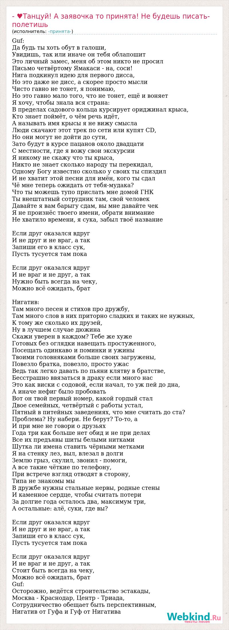 Guf: Да будь ты хоть обут в галоши, Увидишь, так или иначе он тебя облапошит Это личный замес, меня об этом никто не просил Письмо четвёртому Ямакаси - на, соси! Нига подкинул идею для первого дисса, Но это даже не дисс, а скорее просто мысли Чисто гавно не тонет, я понимаю, Но это гавно мало того, что не тонет, ещё и воняет Я хочу, чтобы знала вся страна: В пределах садового кольца курсирует ориджинал крыса, Кто знает поймёт, о чём речь идёт, А называть имя крысы я не вижу смысла Люди скачают этот трек по сети или купят CD, Но они могут не дойти до сути, Зато будут в курсе пацанов около двадцати С местности, где я вожу свои экскурсии Я никому не скажу что ты крыса, Никто не знает сколько народу ты перекидал, Одному Богу известно сколько у своих ты спиздил И не хватит этой песни для имён, кого ты сдал Чё мне теперь ожидать от тебя-мудака? Что ты можешь тупо прислать мне домой ГНК Ты внештатный сотрудник там, свой человек Давайте я вам барыгу сдам, вы мне давайте чек Я не произнёс твоего имени, обрати внимание Не хватило времени, я сука, забыл твоё название Если друг оказался вдруг И не друг и не враг, а так Запиши его в класс сук, Пусть тусуется там пока Если друг оказался вдруг И не враг и не друг, а так Нужно быть всегда на чеку, Можно всё ожидать, брат Нигатив: Там много песен и стихов про дружбу, Там много слов в них приторно сладких и таких не нужных, К тому же сколько их друзей, Ну в лучшем случае дюжина Скажи уверен в каждом? Тебе же хуже Готовых без оглядки навещать простуженного, Посещать одинкаво и поминки и ужины Твоими головняками больше своих загружены, Повезло братка, повезло, просто ужас Ведь так легко давать по пьяни клятву в братстве, Бесстрашно ввязаться в драку если много нас Это как виски с содовой, если начал, то уж пей до дна, А иначе нефиг было пробовать Вот он твой первый номер, какой гордый стал Двое семейных, четвёртый с работы устал, Пятный в питейных заведениях, что мне считать до ста? Проблема? Ну набери. Не берут? То-то, а И при мне не говори о друзьях Года три как больше нет обид и не при делах Все их предъявы шиты белыми нитками Шутка ли имена ставить чёрными метками Я на стенку лез, выл, влезал в долги Землю грыз, скулил, звонил - помоги, А все такие чёткие по телефону, При встрече взгляд отводят в сторону, Типа не знакомы мы В дружбе нужны стальные нервы, родные стены И каменное сердце, чтобы считать потери За долгие года осталось два, максимум три, А остальные: алё, суки, где вы? Если друг оказался вдруг И не друг и не враг, а так Запиши его в класс сук, Пусть тусуется там пока Если друг оказался вдруг И не враг и не друг, а так Стоит быть всегда на чеку, Можно всё ожидать, брат Guf: Осторожно, ведётся строительство эстакады, Москва - Краснодар, Центр - Триада, Сотрудничество обещает быть перспективным, Нигатив от Гуфа и Гуф от Нигатива
