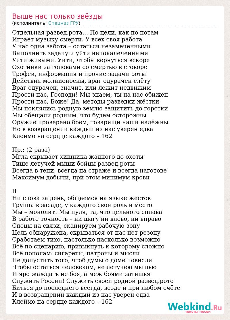 Отдельная развед.рота… По цели, как по нотам Играет музыку смерти. У всех своя работа У нас одна забота – остаться незамеченными Выполнить задачу и уйти непокалеченными Уйти живыми. Уйти, чтобы вернуться вскоре Охотники за головами со смертью в сговоре Трофеи, информация и прочие задачи роты Действия молниеносны, враг одурачен слёту Враг одурачен, значит, или лежит недвижим Прости нас, Господи! Мы знаем, ты на нас обижен Прости нас, Боже! Да, методы разведки жёстки Мы поклялись родную землю защитить до горстки Мы обещали родным, что будем осторожны Оружие проверено боем, товарищи наши надёжны Но в возвращении каждый из нас уверен едва Клеймо на сердце каждого – 162 Пр.: (2 раза) Мгла скрывает хищника жадного до охоты Тише летучей мыши бойцы развед.роты Всегда в тени, всегда на страже и всегда наготове Максимум добычи, при этом минимум крови II Ни слова за день, общаемся на языке жестов Группа в засаде, у каждого свои роль и место Мы – монолит! Мы пуля, та, что цельного сплава В работе точность – ни шагу ни влево, ни вправо Спецы на связи, сканируем рабочую зону Цель обнаружена, скрываться от нас нет резону Сработаем тихо, настолько насколько возможно Всё по сценарию, привыкнуть к которому сложно Всё пополам: сигареты, патроны и мысли Не допустить того, чтоб думы о доме повисли Чтобы остаться человеком, не летучею мышью И яро жаждать не боя, а меж боями затишья Служить России! Служить своей родной развед.роте Биться до последнего всегда, везде и при любом счёте И в возвращении каждый из нас уверен едва Клеймо на сердце каждого – 162