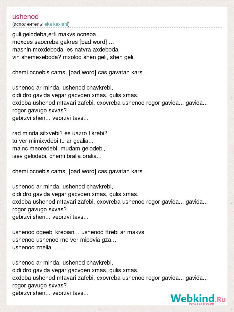 guli gelodeba,erti makvs ocneba... moxdes saocreba gakres [bad word] ... mashin moxdeboda, es natvra axdeboda, vin shemexeboda? mxolod shen geli, shen geli. chemi ocnebis cams, [bad word] cas gavatan kars.. ushenod ar minda, ushenod chavkrebi, didi dro gavida vegar gacvden xmas, gulis xmas. cxdeba ushenod mtavari zafebi, cxovreba ushenod rogor gavida... gavida... rogor gavugo sxvas? gebrzvi shen... vebrzvi tavs... rad minda sitxvebi? es uazro fikrebi? tu ver mimixvdebi tu ar gcalia... mainc meoredebi, mudam gelodebi, isev gelodebi, chemi bralia bralia... chemi ocnebis cams, [bad word] cas gavatan kars... ushenod ar minda, ushenod chavkrebi, didi dro gavida vegar gacvden xmas, gulis xmas. cxdeba ushenod mtavari zafebi, cxovreba ushenod rogor gavida... gavida... rogor gavugo sxvas? gebrzvi shen... vebrzvi tavs... ushenod dgeebi krebian... ushenod ftrebi ar makvs ushenod ushenod me ver mipovia gza... ushenod znelia........ ushenod ar minda, ushenod chavkrebi, didi dro gavida vegar gacvden xmas, gulis xmas. cxdeba ushenod mtavari zafebi, cxovreba ushenod rogor gavida... gavida... rogor gavugo sxvas? gebrzvi shen... vebrzvi tavs...