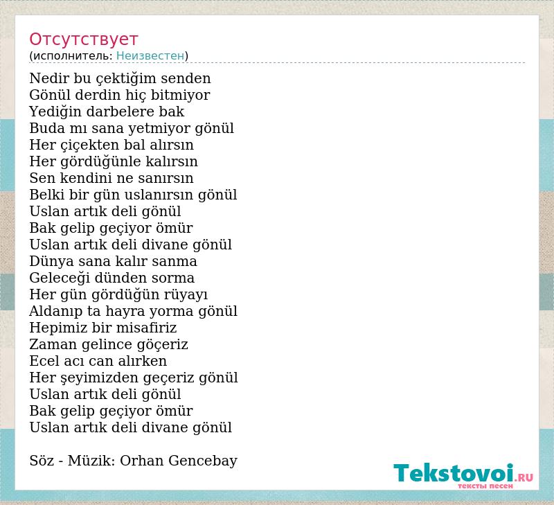 Nedir bu çektiğim senden Gönül derdin hiç bitmiyor Yediğin darbelere bak Buda mı sana yetmiyor gönül Her çiçekten bal alırsın Her gördüğünle kalırsın Sen kendini ne sanırsın Belki bir gün uslanırsın gönül Uslan artık deli gönül Bak gelip geçiyor ömür Uslan artık deli divane gönül Dünya sana kalır sanma Geleceği dünden sorma Her gün gördüğün rüyayı Aldanıp ta hayra yorma gönül Hepimiz bir misafiriz Zaman gelince göçeriz Ecel acı can alırken Her şeyimizden geçeriz gönül Uslan artık deli gönül Bak gelip geçiyor ömür Uslan artık deli divane gönül Söz - Müzik: Orhan Gencebay
