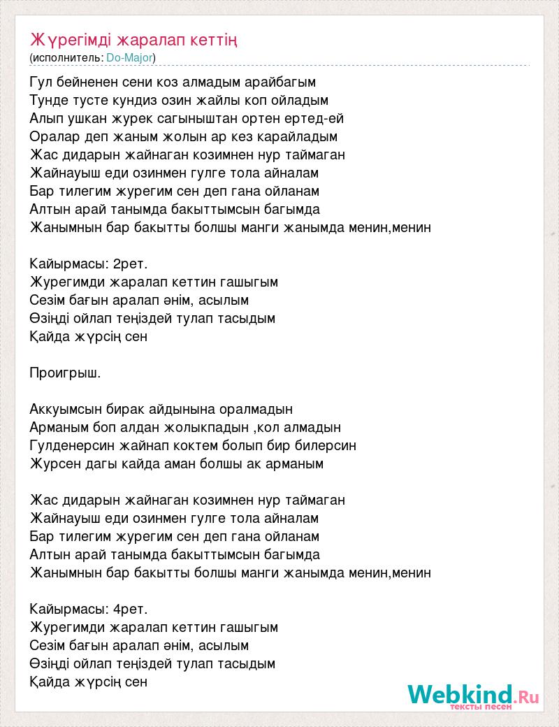 Гул бейненен сени коз алмадым арайбагым Тунде тусте кундиз озин жайлы коп ойладым Алып ушкан журек сагыныштан ортен ертед-ей Оралар деп жаным жолын ар кез карайладым Жас дидарын жайнаган козимнен нур таймаган Жайнауыш еди озинмен гулге тола айналам Бар тилегим журегим сен деп гана ойланам Алтын арай танымда бакыттымсын багымда Жанымнын бар бакытты болшы манги жанымда менин,менин Кайырмасы: 2рет. Журегимди жаралап кеттин гашыгым Сезім бағын аралап әнім, асылым Өзіңді ойлап теңіздей тулап тасыдым Қайда жүрсің сен Проигрыш. Аккуымсын бирак айдынына оралмадын Арманым боп алдан жолыкпадын ,кол алмадын Гулденерсин жайнап коктем болып бир билерсин Журсен дагы кайда аман болшы ак арманым Жас дидарын жайнаган козимнен нур таймаган Жайнауыш еди озинмен гулге тола айналам Бар тилегим журегим сен деп гана ойланам Алтын арай танымда бакыттымсын багымда Жанымнын бар бакытты болшы манги жанымда менин,менин Кайырмасы: 4рет. Журегимди жаралап кеттин гашыгым Сезім бағын аралап әнім, асылым Өзіңді ойлап теңіздей тулап тасыдым Қайда жүрсің сен
