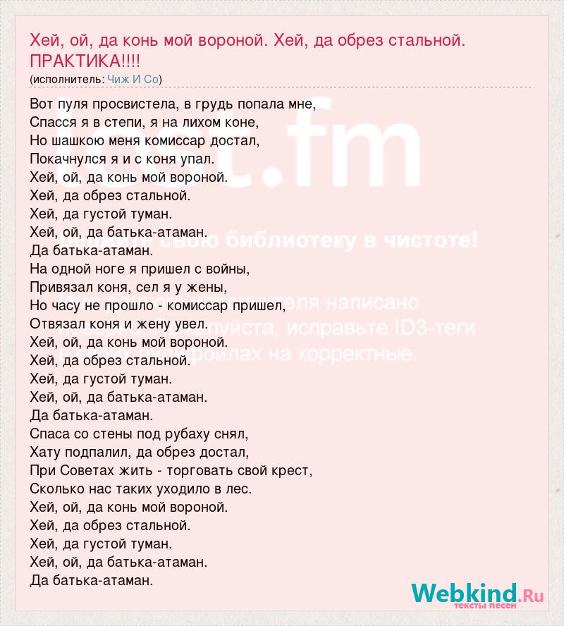 Вот пуля просвистела, в грудь попала мне, Спасся я в степи, я на лихом коне, Но шашкою меня комиссар достал, Покачнулся я и с коня упал. Хей, ой, да конь мой вороной. Хей, да обрез стальной. Хей, да густой туман. Хей, ой, да батька-атаман. Да батька-атаман. На одной ноге я пришел с войны, Привязал коня, сел я у жены, Но часу не прошло - комиссар пришел, Отвязал коня и жену увел. Хей, ой, да конь мой вороной. Хей, да обрез стальной. Хей, да густой туман. Хей, ой, да батька-атаман. Да батька-атаман. Спаса со стены под рубаху снял, Хату подпалил, да обрез достал, При Советах жить - торговать свой крест, Сколько нас таких уходило в лес. Хей, ой, да конь мой вороной. Хей, да обрез стальной. Хей, да густой туман. Хей, ой, да батька-атаман. Да батька-атаман.