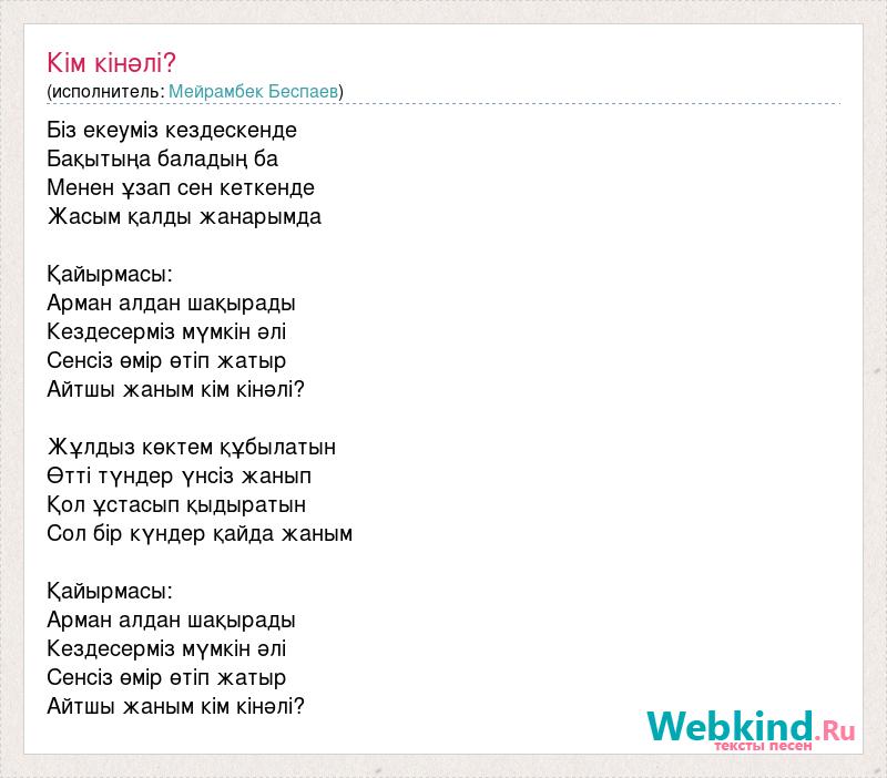 Біз екеуміз кездескенде Бақытыңа баладың ба Менен ұзап сен кеткенде Жасым қалды жанарымда Қайырмасы: Арман алдан шақырады Кездесерміз мүмкін әлі Сенсіз өмір өтіп жатыр Айтшы жаным кім кінәлі? Жұлдыз көктем құбылатын Өтті түндер үнсіз жанып Қол ұстасып қыдыратын Сол бір күндер қайда жаным Қайырмасы: Арман алдан шақырады Кездесерміз мүмкін әлі Сенсіз өмір өтіп жатыр Айтшы жаным кім кінәлі?