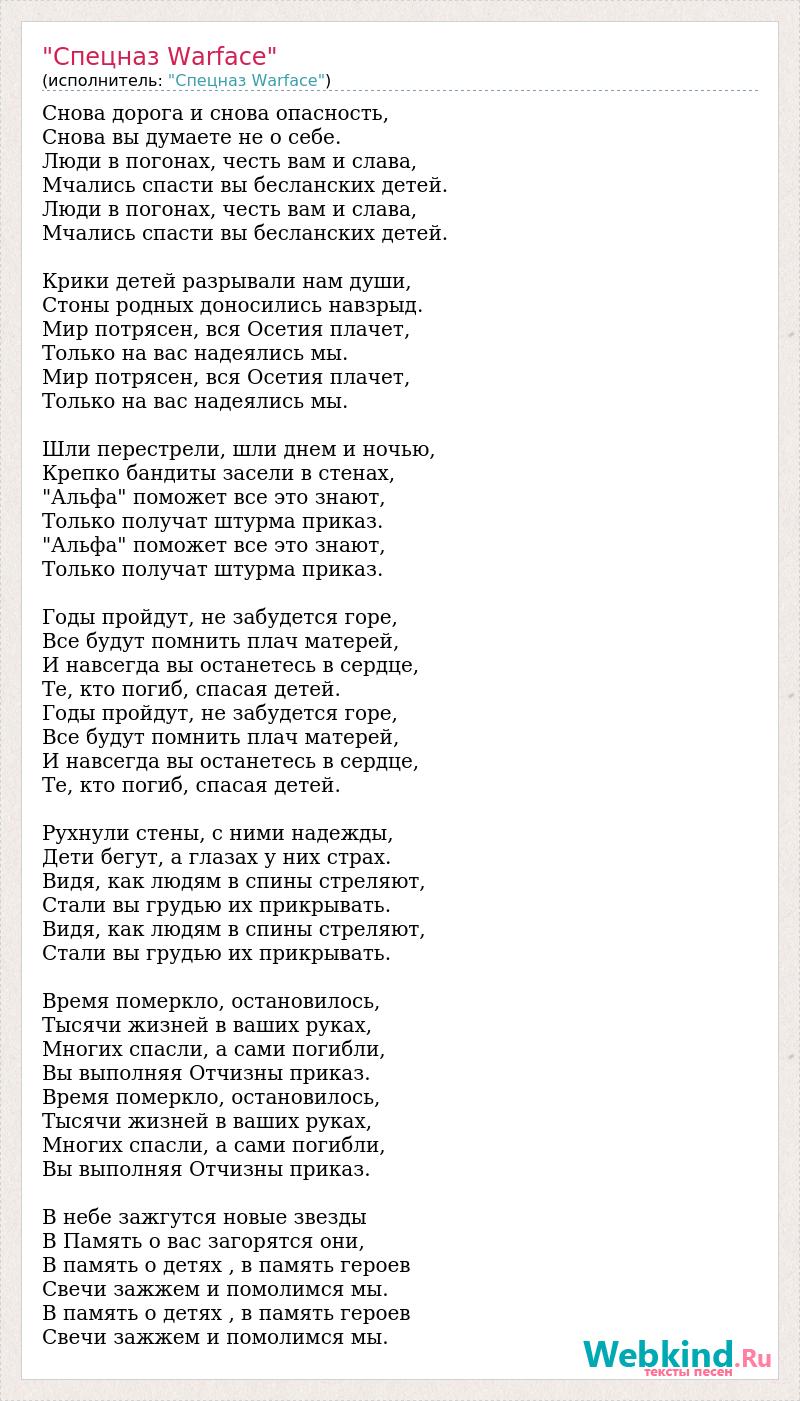 Снова дорога и снова опасность, Снова вы думаете не о себе. Люди в погонах, честь вам и слава, Мчались спасти вы бесланских детей. Люди в погонах, честь вам и слава, Мчались спасти вы бесланских детей. Крики детей разрывали нам души, Стоны родных доносились навзрыд. Мир потрясен, вся Осетия плачет, Только на вас надеялись мы. Мир потрясен, вся Осетия плачет, Только на вас надеялись мы. Шли перестрели, шли днем и ночью, Крепко бандиты засели в стенах, "Альфа" поможет все это знают, Только получат штурма приказ. "Альфа" поможет все это знают, Только получат штурма приказ. Годы пройдут, не забудется горе, Все будут помнить плач матерей, И навсегда вы останетесь в сердце, Те, кто погиб, спасая детей. Годы пройдут, не забудется горе, Все будут помнить плач матерей, И навсегда вы останетесь в сердце, Те, кто погиб, спасая детей. Рухнули стены, с ними надежды, Дети бегут, а глазах у них страх. Видя, как людям в спины стреляют, Стали вы грудью их прикрывать. Видя, как людям в спины стреляют, Стали вы грудью их прикрывать. Время померкло, остановилось, Тысячи жизней в ваших руках, Многих спасли, а сами погибли, Вы выполняя Отчизны приказ. Время померкло, остановилось, Тысячи жизней в ваших руках, Многих спасли, а сами погибли, Вы выполняя Отчизны приказ. В небе зажгутся новые звезды В Память о вас загорятся они, В память о детях , в память героев Свечи зажжем и помолимся мы. В память о детях , в память героев Свечи зажжем и помолимся мы.