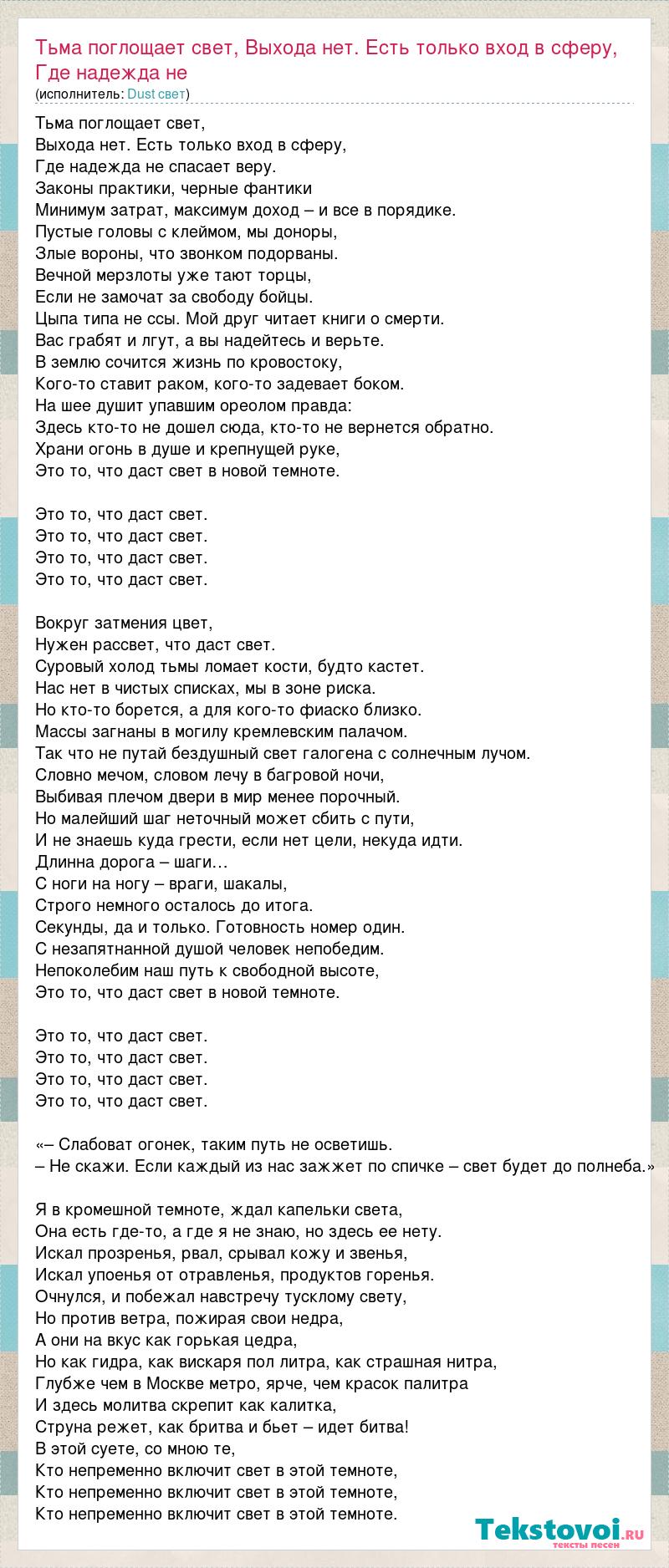 Главная→Исполнители→Dust свет→Тьма поглощает свет, Выхода нет. Есть только вход в сферу, Где надежда не