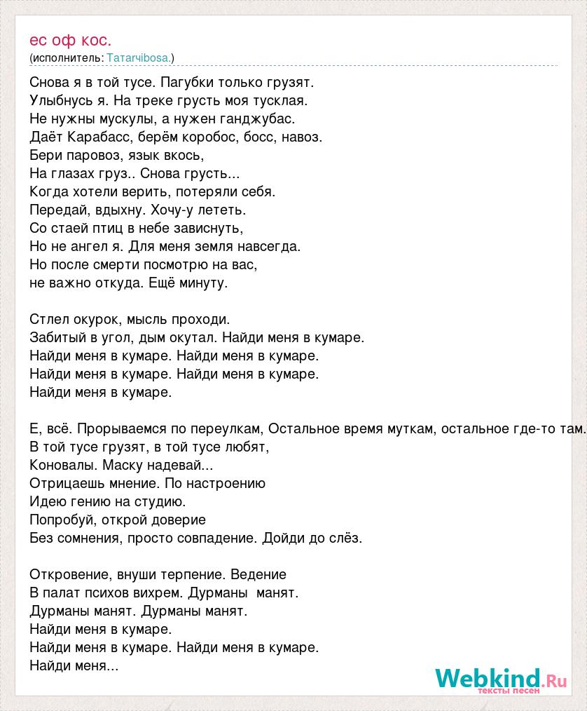 Снова я в той тусе. Пагубки только грузят. Улыбнусь я. На треке грусть моя тусклая. Не нужны мускулы, а нужен ганджубас. Даёт Карабасс, берём коробос, босс, навоз. Бери паровоз, язык вкось, На глазах груз.. Снова грусть... Когда хотели верить, потеряли себя. Передай, вдыхну. Хочу-у лететь. Со стаей птиц в небе зависнуть, Но не ангел я. Для меня земля навсегда. Но после смерти посмотрю на вас, не важно откуда. Ещё минуту. Стлел окурок, мысль проходи. Забитый в угол, дым окутал. Найди меня в кумаре. Найди меня в кумаре. Найди меня в кумаре. Найди меня в кумаре. Найди меня в кумаре. Найди меня в кумаре. Е, всё. Прорываемся по переулкам, Остальное время муткам, остальное где-то там. В той тусе грузят, в той тусе любят, Коновалы. Маску надевай... Отрицаешь мнение. По настроению Идею гению на студию. Попробуй, открой доверие Без сомнения, просто совпадение. Дойди до слёз. Откровение, внуши терпение. Ведение В палат психов вихрем. Дурманы манят. Дурманы манят. Дурманы манят. Найди меня в кумаре. Найди меня в кумаре. Найди меня в кумаре. Найди меня...