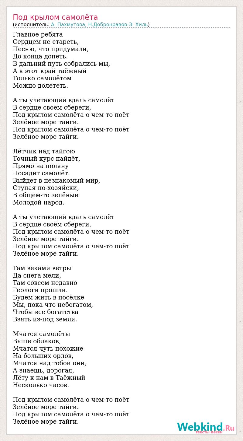 Главное ребята Сердцем не стареть, Песню, что придумали, До конца допеть. В дальний путь собрались мы, А в этот край таёжный Только самолётом Можно долететь. А ты улетающий вдаль самолёт В сердце своём сбереги, Под крылом самолёта о чем-то поёт Зелёное море тайги. Под крылом самолёта о чем-то поёт Зелёное море тайги. Лётчик над тайгою Точный курс найдёт, Прямо на поляну Посадит самолёт. Выйдет в незнакомый мир, Ступая по-хозяйски, В общем-то зелёный Молодой народ. А ты улетающий вдаль самолёт В сердце своём сбереги, Под крылом самолёта о чем-то поёт Зелёное море тайги. Под крылом самолёта о чем-то поёт Зелёное море тайги. Там веками ветры Да снега мели, Там совсем недавно Геологи прошли. Будем жить в посёлке Мы, пока что небогатом, Чтобы все богатства Взять из-под земли. Мчатся самолёты Выше облаков, Мчатся чуть похожие На больших орлов, Мчатся над тобой они, А знаешь, дорогая, Лёту к нам в Таёжный Несколько часов. Под крылом самолёта о чем-то поёт Зелёное море тайги. Под крылом самолёта о чем-то поёт Зелёное море тайги.