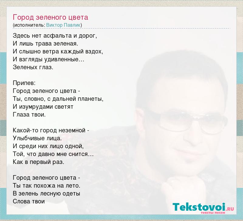 Здесь нет асфальта и дорог, И лишь трава зеленая. И слышно ветра каждый вздох, И взгляды удивленные… Зеленых глаз. Припев: Город зеленого цвета - Ты, словно, с дальней планеты, И изумрудами светят Глаза твои. Какой-то город неземной - Улыбчивые лица. И среди них лицо одной, Той, что давно мне снится… Как в первый раз. Город зеленого цвета - Ты так похожа на лето. В зелень лесную одеты Слова твои