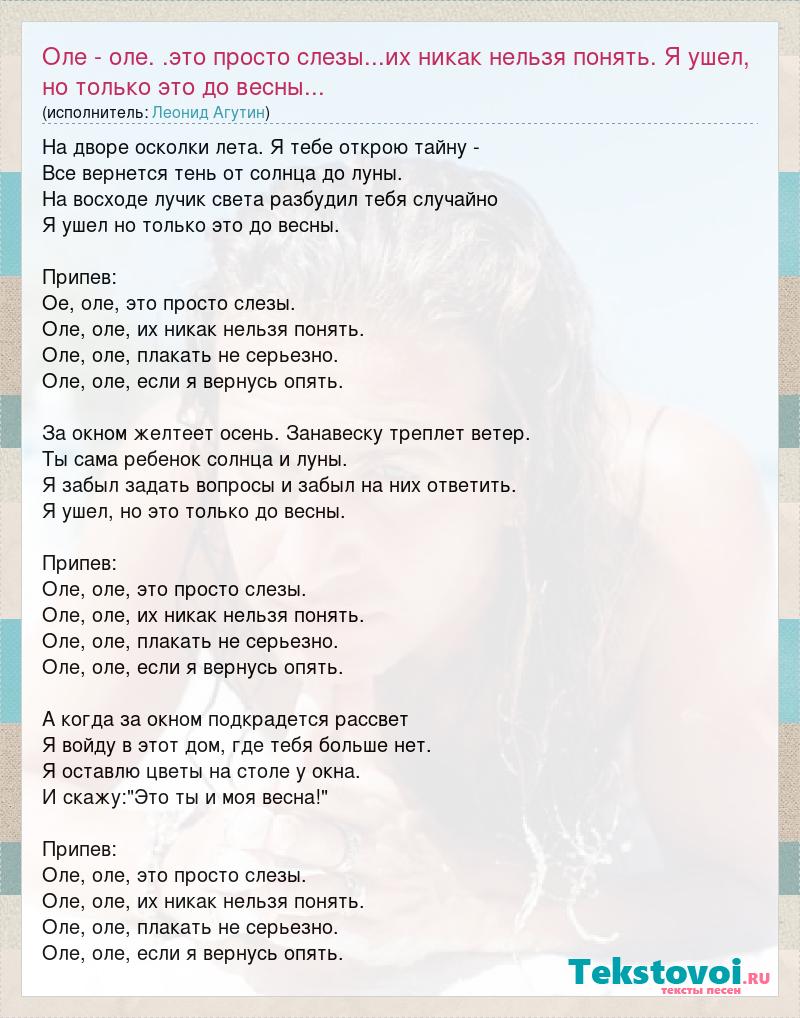 На дворе осколки лета. Я тебе открою тайну - Все вернется тень от солнца до луны. На восходе лучик света разбудил тебя случайно Я ушел но только это до весны. Припев: Ое, оле, это просто слезы. Оле, оле, их никак нельзя понять. Оле, оле, плакать не серьезно. Оле, оле, если я вернусь опять. За окном желтеет осень. Занавеску треплет ветер. Ты сама ребенок солнца и луны. Я забыл задать вопросы и забыл на них ответить. Я ушел, но это только до весны. Припев: Оле, оле, это просто слезы. Оле, оле, их никак нельзя понять. Оле, оле, плакать не серьезно. Оле, оле, если я вернусь опять. А когда за окном подкрадется рассвет Я войду в этот дом, где тебя больше нет. Я оставлю цветы на столе у окна. И скажу:"Это ты и моя весна!" Припев: Оле, оле, это просто слезы. Оле, оле, их никак нельзя понять. Оле, оле, плакать не серьезно. Оле, оле, если я вернусь опять.