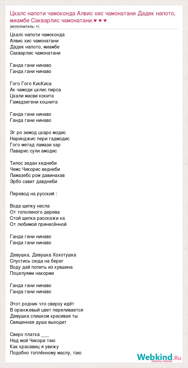 Цкалс напоти чамоконда Алвис хис чамонатани Дадек напото, миамбе Сакварлис чамонатани Ганда гани нинаво Ганда гани нинаво Гого Гого КисКиса Ак чамоди цклис пирса Цкали масви кокита Гамадзегени коцнита Ганда гани нинаво Ганда гани нинаво Эг ро земод цкаро модис Наринджис пери гадмодис Гого метад ламази хар Паварис сули амодис Тилос зедан кеднеби Чемс Чикорис веднеби Ламазебс ром давинахав Эрбо савит давднеби Перевод на русский : Вода щепку несла От тополиного дерева Стой щепка расскажи ка От любимой принесённой Ганда гани нинаво Ганда гани нинаво Девушка, Девушка Хохотушка Спустись сюда на берег Воду дай попить из кувшина Поцелуями накорми Ганда гани нинаво Ганда гани нинаво Этот родник что сверху идёт В оранжевый цвет переливается Девушка слишком красивая ты Священная душа выходит Сверх платка ___ Над мой Чикори таю Как красавиц я увижу Подобно топлённому маслу, таю