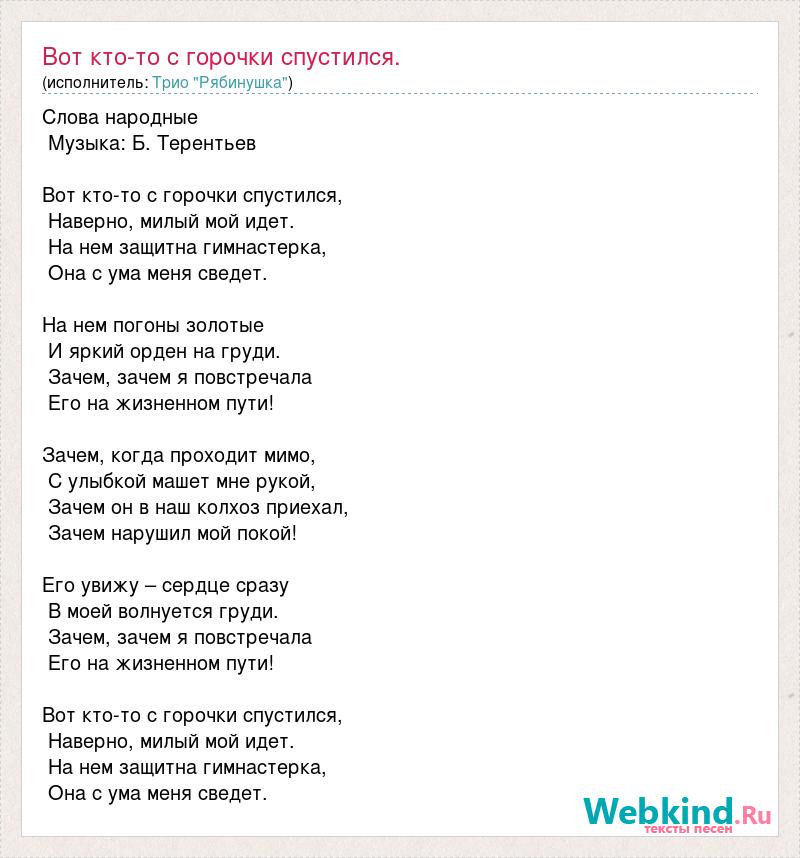 Слова народные Музыка: Б. Терентьев Вот кто-то с горочки спустился, Наверно, милый мой идет. На нем защитна гимнастерка, Она с ума меня сведет. На нем погоны золотые И яркий орден на груди. Зачем, зачем я повстречала Его на жизненном пути! Зачем, когда проходит мимо, С улыбкой машет мне рукой, Зачем он в наш колхоз приехал, Зачем нарушил мой покой! Его увижу – сердце сразу В моей волнуется груди. Зачем, зачем я повстречала Его на жизненном пути! Вот кто-то с горочки спустился, Наверно, милый мой идет. На нем защитна гимнастерка, Она с ума меня сведет.