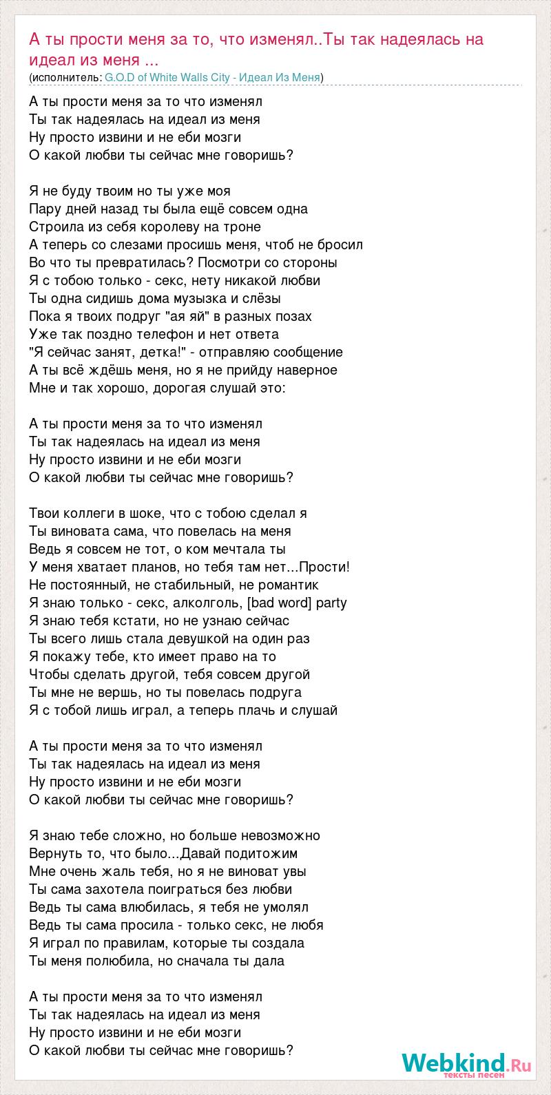 А ты прости меня за то что изменял Ты так надеялась на идеал из меня Ну просто извини и не еби мозги О какой любви ты сейчас мне говоришь? Я не буду твоим но ты уже моя Пару дней назад ты была ещё совсем одна Строила из себя королеву на троне А теперь со слезами просишь меня, чтоб не бросил Во что ты превратилась? Посмотри со стороны Я с тобою только - секс, нету никакой любви Ты одна сидишь дома музызка и слёзы Пока я твоих подруг "ая яй" в разных позах Уже так поздно телефон и нет ответа "Я сейчас занят, детка!" - отправляю сообщение А ты всё ждёшь меня, но я не прийду наверное Мне и так хорошо, дорогая слушай это: А ты прости меня за то что изменял Ты так надеялась на идеал из меня Ну просто извини и не еби мозги О какой любви ты сейчас мне говоришь? Твои коллеги в шоке, что с тобою сделал я Ты виновата сама, что повелась на меня Ведь я совсем не тот, о ком мечтала ты У меня хватает планов, но тебя там нет...Прости! Не постоянный, не стабильный, не романтик Я знаю только - секс, алколголь, [bad word] party Я знаю тебя кстати, но не узнаю сейчас Ты всего лишь стала девушкой на один раз Я покажу тебе, кто имеет право на то Чтобы сделать другой, тебя совсем другой Ты мне не вершь, но ты повелась подруга Я с тобой лишь играл, а теперь плачь и слушай А ты прости меня за то что изменял Ты так надеялась на идеал из меня Ну просто извини и не еби мозги О какой любви ты сейчас мне говоришь? Я знаю тебе сложно, но больше невозможно Вернуть то, что было...Давай подитожим Мне очень жаль тебя, но я не виноват увы Ты сама захотела поиграться без любви Ведь ты сама влюбилась, я тебя не умолял Ведь ты сама просила - только секс, не любя Я играл по правилам, которые ты создала Ты меня полюбила, но сначала ты дала А ты прости меня за то что изменял Ты так надеялась на идеал из меня Ну просто извини и не еби мозги О какой любви ты сейчас мне говоришь?