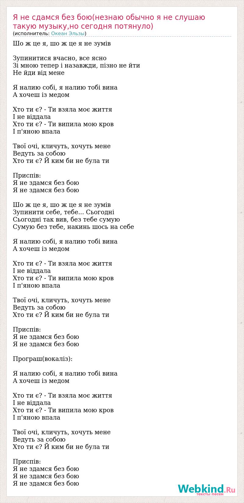 Шо ж це я, шо ж це я не зумів Зупинитися вчасно, все ясно Зі мною тепер і назавжди, пізно не йти Не йди від мене Я налию собі, я налию тобі вина А хочеш із медом Хто ти є? - Ти взяла моє життя І не віддала Хто ти є? - Ти випила мою кров І п'яною впала Твої очі, кличуть, хочуть мене Ведуть за собою Хто ти є? Й ким би не була ти Приспів: Я не здамся без бою Я не здамся без бою Шо ж це я, шо ж це я не зумів Зупинити себе, тебе... Сьогодні Сьогодні так вив, без тебе сумую Сумую без тебе, накинь шось на себе Я налию собі, я налию тобі вина А хочеш із медом Хто ти є? - Ти взяла моє життя І не віддала Хто ти є? - Ти випила мою кров І п'яною впала Твої очі, кличуть, хочуть мене Ведуть за собою Хто ти є? Й ким би не була ти Приспів: Я не здамся без бою Я не здамся без бою Програш(вокаліз): Я налию собі, я налию тобі вина А хочеш із медом Хто ти є? - Ти взяла моє життя І не віддала Хто ти є? - Ти випила мою кров І п'яною впала Твої очі, кличуть, хочуть мене Ведуть за собою Хто ти є? Й ким би не була ти Приспів: Я не здамся без бою Я не здамся без бою Я не здамся без бою