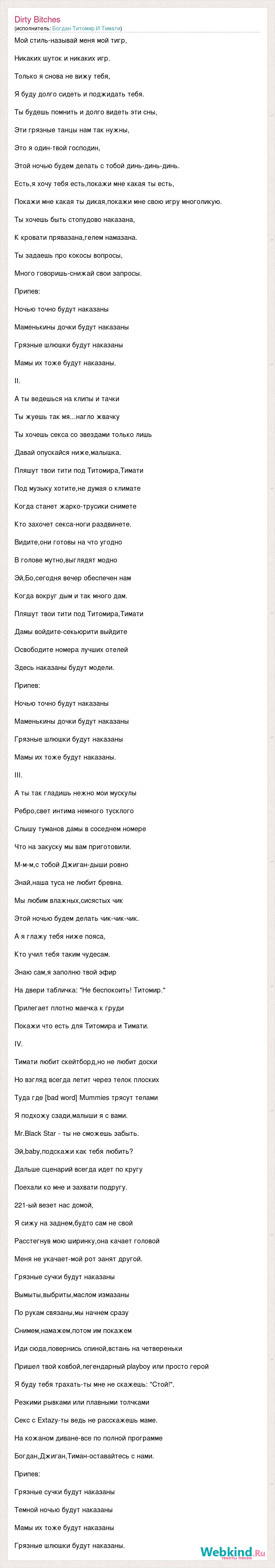 Мой стиль-называй меня мой тигр, Никаких шуток и никаких игр. Только я снова не вижу тебя, Я буду долго сидеть и поджидать тебя. Ты будешь помнить и долго видеть эти сны, Эти грязные танцы нам так нужны, Это я один-твой господин, Этой ночью будем делать с тобой динь-динь-динь. Есть,я хочу тебя есть,покажи мне какая ты есть, Покажи мне какая ты дикая,покажи мне свою игру многоликую. Ты хочешь быть стопудово наказана, К кровати прявазана,гелем намазана. Ты задаешь про кокосы вопросы, Много говоришь-снижай свои запросы. Припев: Ночью точно будут наказаны Маменькины дочки будут наказаны Грязные шлюшки будут наказаны Мамы их тоже будут наказаны. II. А ты ведешься на клипы и тачки Ты жуешь так мя...нагло жвачку Ты хочешь секса со звездами только лишь Давай опускайся ниже,малышка. Пляшут твои тити под Титомира,Тимати Под музыку хотите,не думая о климате Когда станет жарко-трусики снимете Кто захочет секса-ноги раздвинете. Видите,они готовы на что угодно В голове мутно,выглядят модно Эй,Бо,сегодня вечер обеспечен нам Когда вокруг дым и так много дам. Пляшут твои тити под Титомира,Тимати Дамы войдите-секьюрити выйдите Освободите номера лучших отелей Здесь наказаны будут модели. Припев: Ночью точно будут наказаны Маменькины дочки будут наказаны Грязные шлюшки будут наказаны Мамы их тоже будут наказаны. III. А ты так гладишь нежно мои мускулы Ребро,свет интима немного тусклого Слышу туманов дамы в соседнем номере Что на закуску мы вам приготовили. М-м-м,с тобой Джиган-дыши ровно Знай,наша туса не любит бревна. Мы любим влажных,сисястых чик Этой ночью будем делать чик-чик-чик. А я глажу тебя ниже пояса, Кто учил тебя таким чудесам. Знаю сам,я заполню твой эфир На двери табличка: "Не беспокоить! Титомир." Прилегает плотно маечка к груди Покажи что есть для Титомира и Тимати. IV. Тимати любит скейтборд,но не любит доски Но взгляд всегда летит через телок плоских Туда где [bad word] Mummies трясут телами Я подхожу сзади,малыши я с вами. Mr.Black Star - ты не сможешь забыть. Эй,baby,подскажи как тебя любить? Дальше сценарий всегда идет по кругу Поехали ко мне и захвати подругу. 221-ый везет нас домой, Я сижу на заднем,будто сам не свой Расстегнув мою ширинку,она качает головой Меня не укачает-мой рот занят другой. Грязные сучки будут наказаны Вымыты,выбриты,маслом измазаны По рукам связаны,мы начнем сразу Снимем,намажем,потом им покажем Иди сюда,повернись спиной,встань на четвереньки Пришел твой ковбой,легендарный playboy или просто герой Я буду тебя трахать-ты мне не скажешь: "Стой!". Резкими рывками или плавными толчками Секс с Extazy-ты ведь не расскажешь маме. На кожаном диване-все по полной программе Богдан,Джиган,Тиман-оставайтесь с нами. Припев: Грязные сучки будут наказаны Темной ночью будут наказаны Мамы их тоже будут наказаны Грязные шлюшки будут наказаны.