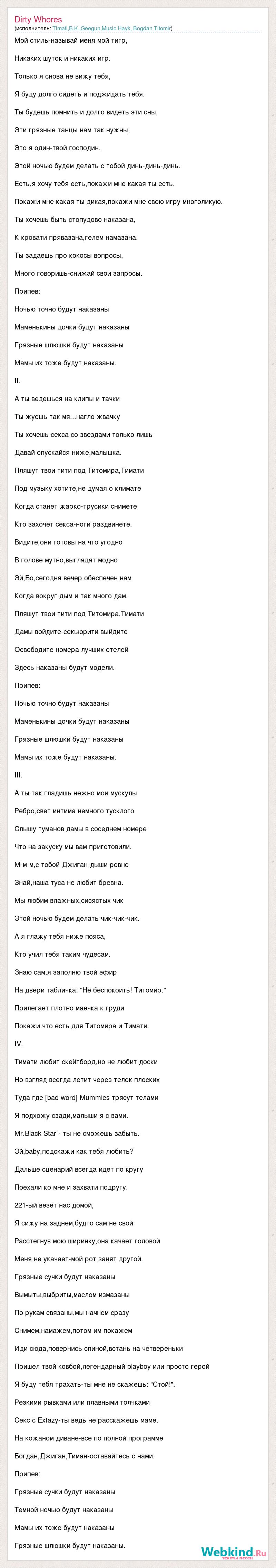 Мой стиль-называй меня мой тигр, Никаких шуток и никаких игр. Только я снова не вижу тебя, Я буду долго сидеть и поджидать тебя. Ты будешь помнить и долго видеть эти сны, Эти грязные танцы нам так нужны, Это я один-твой господин, Этой ночью будем делать с тобой динь-динь-динь. Есть,я хочу тебя есть,покажи мне какая ты есть, Покажи мне какая ты дикая,покажи мне свою игру многоликую. Ты хочешь быть стопудово наказана, К кровати прявазана,гелем намазана. Ты задаешь про кокосы вопросы, Много говоришь-снижай свои запросы. Припев: Ночью точно будут наказаны Маменькины дочки будут наказаны Грязные шлюшки будут наказаны Мамы их тоже будут наказаны. II. А ты ведешься на клипы и тачки Ты жуешь так мя...нагло жвачку Ты хочешь секса со звездами только лишь Давай опускайся ниже,малышка. Пляшут твои тити под Титомира,Тимати Под музыку хотите,не думая о климате Когда станет жарко-трусики снимете Кто захочет секса-ноги раздвинете. Видите,они готовы на что угодно В голове мутно,выглядят модно Эй,Бо,сегодня вечер обеспечен нам Когда вокруг дым и так много дам. Пляшут твои тити под Титомира,Тимати Дамы войдите-секьюрити выйдите Освободите номера лучших отелей Здесь наказаны будут модели. Припев: Ночью точно будут наказаны Маменькины дочки будут наказаны Грязные шлюшки будут наказаны Мамы их тоже будут наказаны. III. А ты так гладишь нежно мои мускулы Ребро,свет интима немного тусклого Слышу туманов дамы в соседнем номере Что на закуску мы вам приготовили. М-м-м,с тобой Джиган-дыши ровно Знай,наша туса не любит бревна. Мы любим влажных,сисястых чик Этой ночью будем делать чик-чик-чик. А я глажу тебя ниже пояса, Кто учил тебя таким чудесам. Знаю сам,я заполню твой эфир На двери табличка: "Не беспокоить! Титомир." Прилегает плотно маечка к груди Покажи что есть для Титомира и Тимати. IV. Тимати любит скейтборд,но не любит доски Но взгляд всегда летит через телок плоских Туда где [bad word] Mummies трясут телами Я подхожу сзади,малыши я с вами. Mr.Black Star - ты не сможешь забыть. Эй,baby,подскажи как тебя любить? Дальше сценарий всегда идет по кругу Поехали ко мне и захвати подругу. 221-ый везет нас домой, Я сижу на заднем,будто сам не свой Расстегнув мою ширинку,она качает головой Меня не укачает-мой рот занят другой. Грязные сучки будут наказаны Вымыты,выбриты,маслом измазаны По рукам связаны,мы начнем сразу Снимем,намажем,потом им покажем Иди сюда,повернись спиной,встань на четвереньки Пришел твой ковбой,легендарный playboy или просто герой Я буду тебя трахать-ты мне не скажешь: "Стой!". Резкими рывками или плавными толчками Секс с Extazy-ты ведь не расскажешь маме. На кожаном диване-все по полной программе Богдан,Джиган,Тиман-оставайтесь с нами. Припев: Грязные сучки будут наказаны Темной ночью будут наказаны Мамы их тоже будут наказаны Грязные шлюшки будут наказаны.
