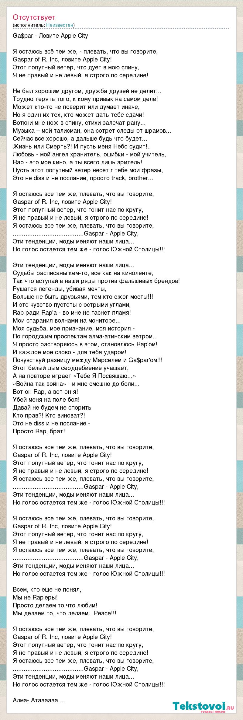 Ga$par - Ловите Apple City Я остаюсь всё тем же, - плевать, что вы говорите, Gaspar of R. Inc, ловите Apple City! Этот попутный ветер, что дует в мою спину, Я не правый и не левый, я строго по середине! Не был хорошим другом, дружба друзей не делит... Трудно терять того, к кому привык на самом деле! Может кто-то не поверит или думает иначе, Но я один их тех, кто может дать тебе сдачи! Воткни мне нож в спину, стихи залечат рану... Музыка – мой талисман, она сотрет следы от шрамов... Сейчас все хорошо, а дальше будь что будет... Жизнь или Смерть?! И пусть меня Небо судит!.. Любовь - мой ангел хранитель, ошибки - мой учитель, Rap - это мое кино, а ты всего лишь зритель! Пусть этот попутный ветер несет r тебе мои фразы, Это не diss и не послание, просто track, brother... Я остаюсь все тем же, плевать, что вы говорите, Gaspar of R. Inc, ловите Apple City! Этот попутный ветер, что гонит нас по кругу, Я не правый и не левый, я строго по середине! Я остаюсь все тем же, плевать, что вы говорите, .......................................Gaspar - Apple City, Эти тенденции, моды меняют наши лица... Но голос остается тем же - голос Южной Столицы!!! Эти тенденции, моды меняют наши лица... Судьбы расписаны кем-то, все как на киноленте, Так что вступай в наши ряды против фальшивых брендов! Рушатся легенды, убивая мечты, Больше не быть друзьями, тем кто сжог мосты!!! И это чувство пустоты с острыми углами, Rap ради Rap'а - во мне не гаснет пламя! Мои старания волнами на мониторе... Моя судьба, мое признание, моя история - По городским проспектам алма-атинским ветром... Я просто растворяюсь в этом, становлюсь Rap'ом! И каждое мое слово - для тебя ударом! Почувствуй разницу между Марселем и Ga$par'ом!!! Этот белый дым сердцебиение учащает, А на повторе играет «Тебе Я Посвящаю...» «Война так война» - и мне смешно до боли... Вот он Rap, а вот он я! Убей меня на поле боя! Давай не будем не спорить Кто прав?! Kто виноват?! Это не diss и не послание - Просто Rap, брат! Я остаюсь все тем же, плевать, что вы говорите, Gaspar of R. Inc, ловите Apple City! Этот попутный ветер, что гонит нас по кругу, Я не правый и не левый, я строго по середине! Я остаюсь все тем же, плевать, что вы говорите, .......................................Gaspar - Apple City, Эти тенденции, моды меняют наши лица... Но голос остается тем же - голос Южной Столицы!!! Я остаюсь все тем же, плевать, что вы говорите, Gaspar of R. Inc, ловите Apple City! Этот попутный ветер, что гонит нас по кругу, Я не правый и не левый, я строго по середине! Я остаюсь все тем же, плевать, что вы говорите, .......................................Gaspar - Apple City, Эти тенденции, моды меняют наши лица... Но голос остается тем же - голос Южной Столицы!!! Всем, кто еще не понял, Мы не Rap'еры! Просто делаем то,что любим! Мы делаем то, что делаем...Peace!!! Я остаюсь все тем же, плевать, что вы говорите, Gaspar of R. Inc, ловите Apple City! Этот попутный ветер, что гонит нас по кругу, Я не правый и не левый, я строго по середине! Я остаюсь все тем же, плевать, что вы говорите, .......................................Gaspar - Apple City, Эти тенденции, моды меняют наши лица... Но голос остается тем же - голос Южной Столицы!!! Алма- Атаааааа....