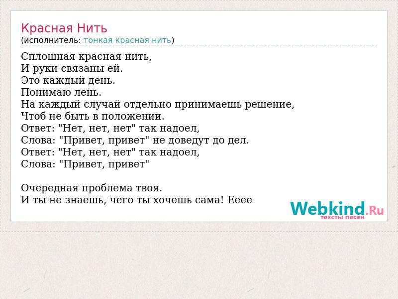 Сплошная красная нить, И руки связаны ей. Это каждый день. Понимаю лень. На каждый случай отдельно принимаешь решение, Чтоб не быть в положении. Ответ: "Нет, нет, нет" так надоел, Слова: "Привет, привет" не доведут до дел. Ответ: "Нет, нет, нет" так надоел, Слова: "Привет, привет" Очередная проблема твоя. И ты не знаешь, чего ты хочешь сама! Ееее