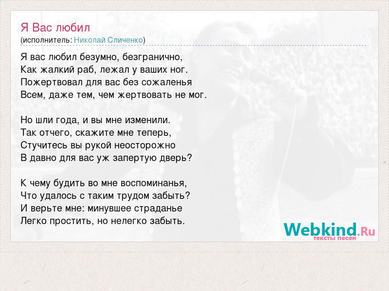Я вас любил безумно, безгранично, Как жалкий раб, лежал у ваших ног. Пожертвовал для вас без сожаленья Всем, даже тем, чем жертвовать не мог. Но шли года, и вы мне изменили. Так отчего, скажите мне теперь, Стучитесь вы рукой неосторожно В давно для вас уж запертую дверь? К чему будить во мне воспоминанья, Что удалось с таким трудом забыть? И верьте мне: минувшее страданье Легко простить, но нелегко забыть.