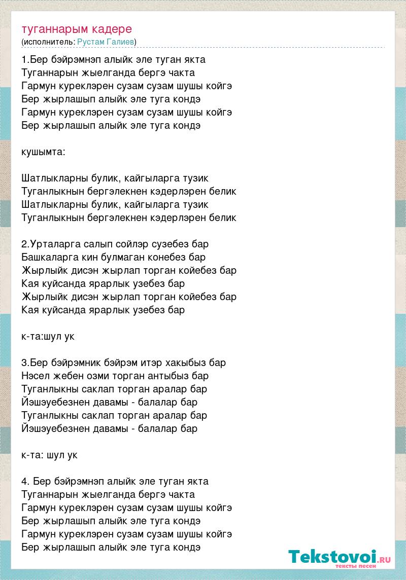1.Бер бэйрэмнэп алыйк эле туган якта Туганнарын жыелганда бергэ чакта Гармун куреклэрен сузам сузам шушы койгэ Бер жырлашып алыйк эле туга кондэ Гармун куреклэрен сузам сузам шушы койгэ Бер жырлашып алыйк эле туга кондэ кушымта: Шатлыкларны булик, кайгыларга тузик Туганлыкнын бергэлекнен кэдерлэрен белик Шатлыкларны булик, кайгыларга тузик Туганлыкнын бергэлекнен кэдерлэрен белик 2.Урталарга салып сойлэр сузебез бар Башкаларга кин булмаган конебез бар Жырлыйк дисэн жырлап торган койебез бар Кая куйсанда ярарлык узебез бар Жырлыйк дисэн жырлап торган койебез бар Кая куйсанда ярарлык узебез бар к-та:шул ук 3.Бер бэйрэмник бэйрэм итэр хакыбыз бар Нэсел жебен озми торган антыбыз бар Туганлыкны саклап торган аралар бар Йэшэуебезнен давамы - балалар бар Туганлыкны саклап торган аралар бар Йэшэуебезнен давамы - балалар бар к-та: шул ук 4. Бер бэйрэмнэп алыйк эле туган якта Туганнарын жыелганда бергэ чакта Гармун куреклэрен сузам сузам шушы койгэ Бер жырлашып алыйк эле туга кондэ Гармун куреклэрен сузам сузам шушы койгэ Бер жырлашып алыйк эле туга кондэ
