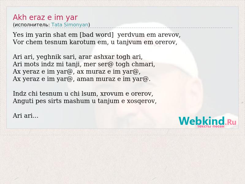 Yes im yarin shat em [bad word] yerdvum em arevov, Vor chem tesnum karotum em, u tanjvum em orerov, Ari ari, yeghnik sari, arar ashxar togh ari, Ari mots indz mi tanji, mer ser@ togh chmari, Ax yeraz e im yar@, ax muraz e im yar@, Ax yeraz e im yar@, aman muraz e im yar@. Indz chi tesnum u chi lsum, xrovum e orerov, Anguti pes sirts mashum u tanjum e xosqerov, Ari ari...