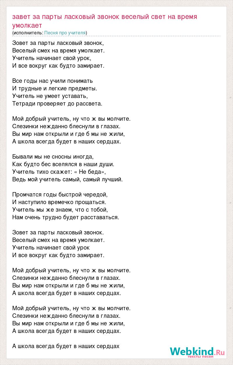 Главная→Исполнители→Песня про учителя→Завет за парты ласковый звонок веселый свет на время умолкает учитель н