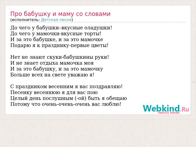 До чего у бабушки–вкусные оладушки! До чего у мамочки-вкусные торты! И за это бабушке, и за это мамочке Подарю я к празднику-первые цветы! Нет не знают скуки-бабушкины руки! И не знает отдыха мамочка моя И за это бабушку, и за это мамочку Больше всех на свете уважаю я! С праздником весенним я вас поздравляю! Песенку весеннюю я для вас пою Целый день послушным (-ой) быть я обещаю Потому что очень-очень-очень вас люблю!