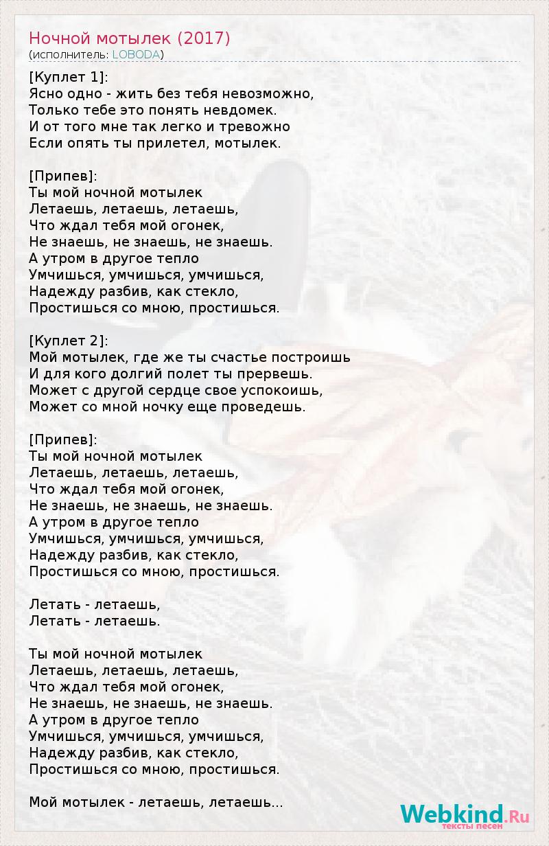 [Куплет 1]: Ясно одно - жить без тебя невозможно, Только тебе это понять невдомек. И от того мне так легко и тревожно Если опять ты прилетел, мотылек. [Припев]: Ты мой ночной мотылек Летаешь, летаешь, летаешь, Что ждал тебя мой огонек, Не знаешь, не знаешь, не знаешь. А утром в другое тепло Умчишься, умчишься, умчишься, Надежду разбив, как стекло, Простишься со мною, простишься. [Куплет 2]: Мой мотылек, где же ты счастье построишь И для кого долгий полет ты прервешь. Может с другой сердце свое успокоишь, Может со мной ночку еще проведешь. [Припев]: Ты мой ночной мотылек Летаешь, летаешь, летаешь, Что ждал тебя мой огонек, Не знаешь, не знаешь, не знаешь. А утром в другое тепло Умчишься, умчишься, умчишься, Надежду разбив, как стекло, Простишься со мною, простишься. Летать - летаешь, Летать - летаешь. Ты мой ночной мотылек Летаешь, летаешь, летаешь, Что ждал тебя мой огонек, Не знаешь, не знаешь, не знаешь. А утром в другое тепло Умчишься, умчишься, умчишься, Надежду разбив, как стекло, Простишься со мною, простишься. Мой мотылек - летаешь, летаешь...