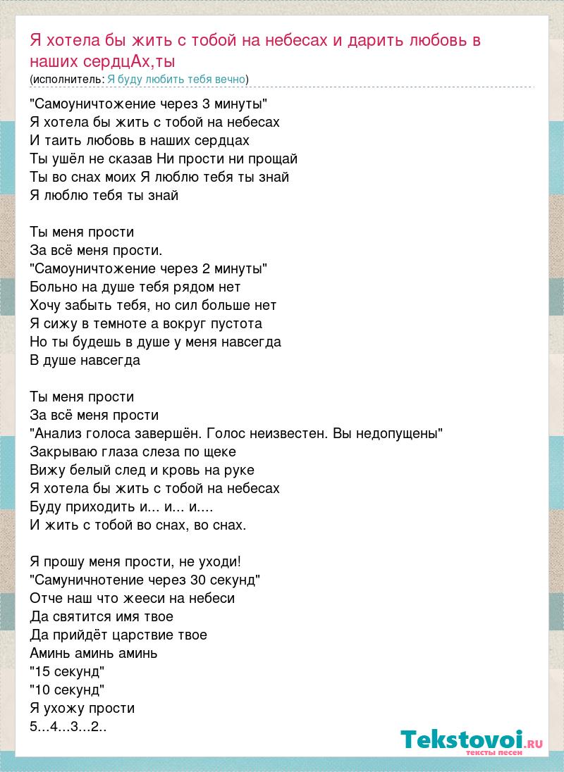 "Самоуничтожение через 3 минуты" Я хотела бы жить с тобой на небесах И таить любовь в наших сердцах Ты ушёл не сказав Ни прости ни прощай Ты во снах моих Я люблю тебя ты знай Я люблю тебя ты знай Ты меня прости За всё меня прости. "Самоуничтожение через 2 минуты" Больно на душе тебя рядом нет Хочу забыть тебя, но сил больше нет Я сижу в темноте а вокруг пустота Но ты будешь в душе у меня навсегда В душе навсегда Ты меня прости За всё меня прости "Анализ голоса завершён. Голос неизвестен. Вы недопущены" Закрываю глаза слеза по щеке Вижу белый след и кровь на руке Я хотела бы жить с тобой на небесах Буду приходить и... и... и.... И жить с тобой во снах, во снах. Я прошу меня прости, не уходи! "Самуничнотение через 30 секунд" Отче наш что жееси на небеси Да святится имя твое Да прийдёт царствие твое Аминь аминь аминь "15 секунд" "10 секунд" Я ухожу прости 5...4...3...2..