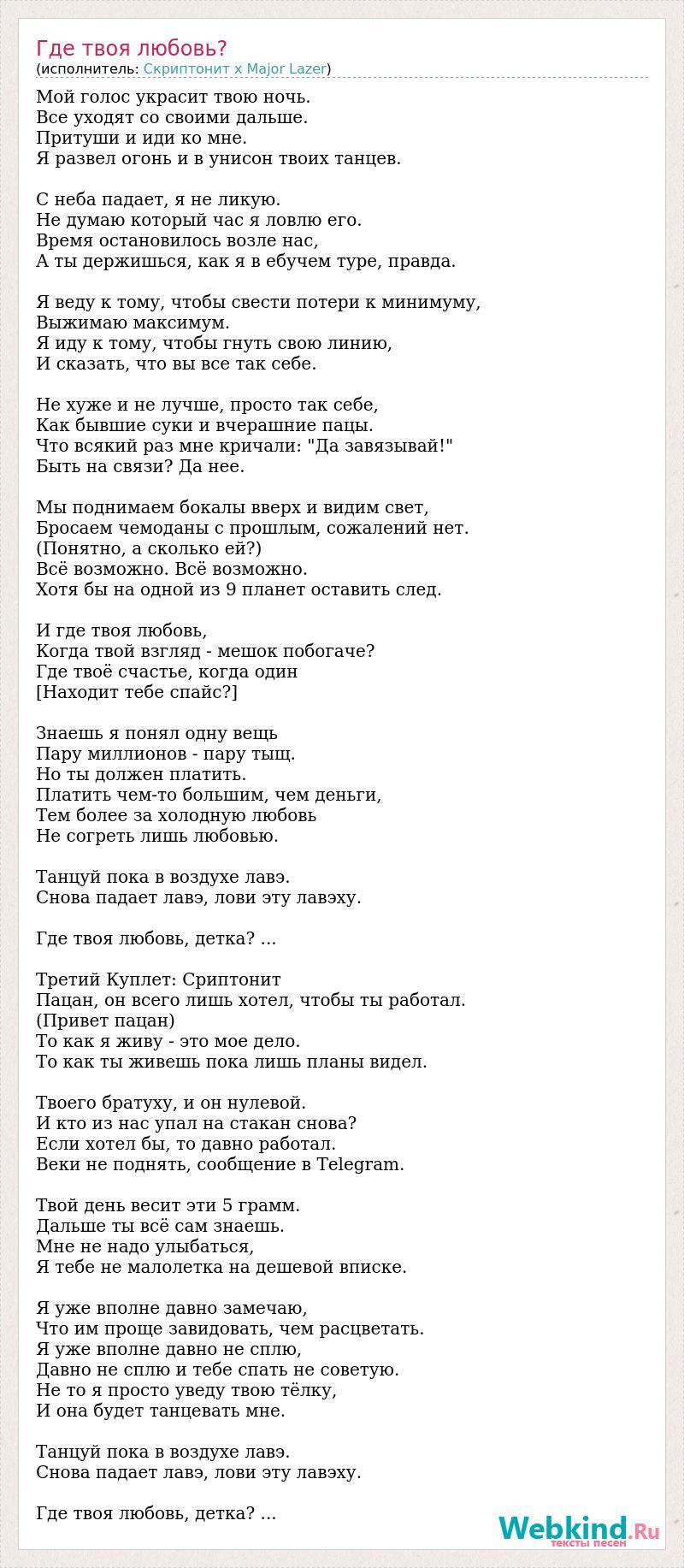 Мой голос украсит твою ночь. Все уходят со своими дальше. Притуши и иди ко мне. Я развел огонь и в унисон твоих танцев. С неба падает, я не ликую. Не думаю который час я ловлю его. Время остановилось возле нас, А ты держишься, как я в ебучем туре, правда. Я веду к тому, чтобы свести потери к минимуму, Выжимаю максимум. Я иду к тому, чтобы гнуть свою линию, И сказать, что вы все так себе. Не хуже и не лучше, просто так себе, Как бывшие суки и вчерашние пацы. Что всякий раз мне кричали: "Да завязывай!" Быть на связи? Да нее. Мы поднимаем бокалы вверх и видим свет, Бросаем чемоданы с прошлым, сожалений нет. (Понятно, а сколько ей?) Всё возможно. Всё возможно. Хотя бы на одной из 9 планет оставить след. И где твоя любовь, Когда твой взгляд - мешок побогаче? Где твоё счастье, когда один [Находит тебе спайс?] Знаешь я понял одну вещь Пару миллионов - пару тыщ. Но ты должен платить. Платить чем-то большим, чем деньги, Тем более за холодную любовь Не согреть лишь любовью. Танцуй пока в воздухе лавэ. Снова падает лавэ, лови эту лавэху. Где твоя любовь, детка? ... Третий Куплет: Сриптонит Пацан, он всего лишь хотел, чтобы ты работал. (Привет пацан) То как я живу - это мое дело. То как ты живешь пока лишь планы видел. Твоего братуху, и он нулевой. И кто из нас упал на стакан снова? Если хотел бы, то давно работал. Веки не поднять, сообщение в Telegram. Твой день весит эти 5 грамм. Дальше ты всё сам знаешь. Мне не надо улыбаться, Я тебе не малолетка на дешевой вписке. Я уже вполне давно замечаю, Что им проще завидовать, чем расцветать. Я уже вполне давно не сплю, Давно не сплю и тебе спать не советую. Не то я просто уведу твою тёлку, И она будет танцевать мне. Танцуй пока в воздухе лавэ. Снова падает лавэ, лови эту лавэху. Где твоя любовь, детка? ...