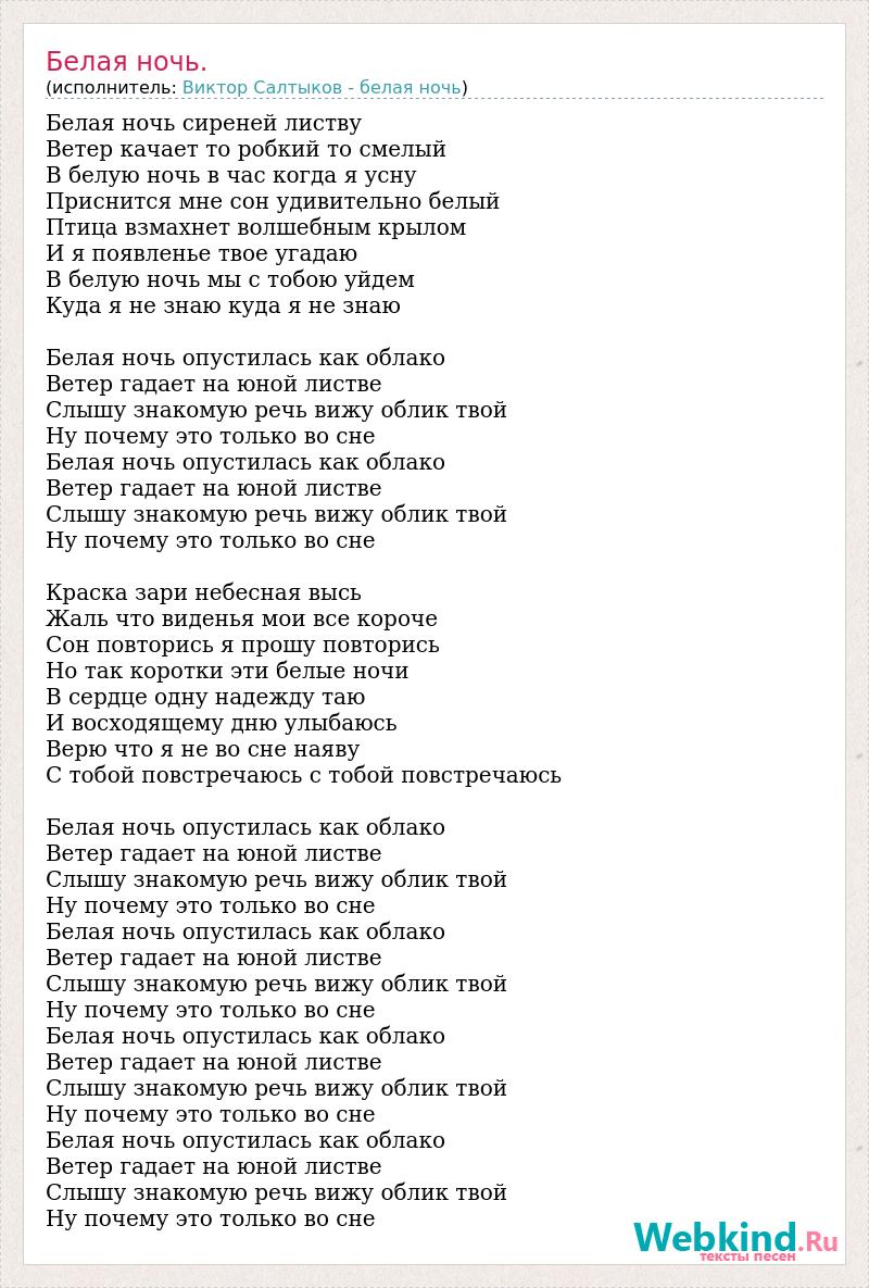 Белая ночь сиреней листву Ветер качает то робкий то смелый В белую ночь в час когда я усну Приснится мне сон удивительно белый Птица взмахнет волшебным крылом И я появленье твое угадаю В белую ночь мы с тобою уйдем Куда я не знаю куда я не знаю Белая ночь опустилась как облако Ветер гадает на юной листве Слышу знакомую речь вижу облик твой Ну почему это только во сне Белая ночь опустилась как облако Ветер гадает на юной листве Слышу знакомую речь вижу облик твой Ну почему это только во сне Краска зари небесная высь Жаль что виденья мои все короче Сон повторись я прошу повторись Но так коротки эти белые ночи В сердце одну надежду таю И восходящему дню улыбаюсь Верю что я не во сне наяву С тобой повстречаюсь с тобой повстречаюсь Белая ночь опустилась как облако Ветер гадает на юной листве Слышу знакомую речь вижу облик твой Ну почему это только во сне Белая ночь опустилась как облако Ветер гадает на юной листве Слышу знакомую речь вижу облик твой Ну почему это только во сне Белая ночь опустилась как облако Ветер гадает на юной листве Слышу знакомую речь вижу облик твой Ну почему это только во сне Белая ночь опустилась как облако Ветер гадает на юной листве Слышу знакомую речь вижу облик твой Ну почему это только во сне
