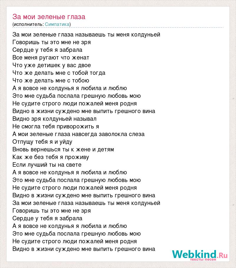 За мои зеленые глаза называешь ты меня колдуньей Говоришь ты это мне не зря Сердце у тебя я забрала Все меня ругают что женат Что уже детишек у вас двое Что же делать мне с тобой тогда Что же делать мне с тобою А я вовсе не колдунья я любила и люблю Это мне судьба послала грешную любовь мою Не судите строго люди пожалей меня родня Видно в жизни суждено мне выпить грешного вина Видно зря колдуньей называл Не смогла тебя приворожить я А мои зеленые глаза навсегда заволокла слеза Отпущу тебя я и уйду Вновь вернешься ты к жене и детям Как же без тебя я проживу Если лучший ты на свете А я вовсе не колдунья я любила и люблю Это мне судьба послала грешную любовь мою Не судите строго люди пожалей меня родня Видно в жизни суждено мне выпить грешного вина За мои зеленые глаза называешь ты меня колдуньей Говоришь ты это мне не зря Сердце у тебя я забрала А я вовсе не колдунья я любила и люблю Это мне судьба послала грешную любовь мою Не судите строго люди пожалей меня родня Видно в жизни суждено мне выпить грешного вина