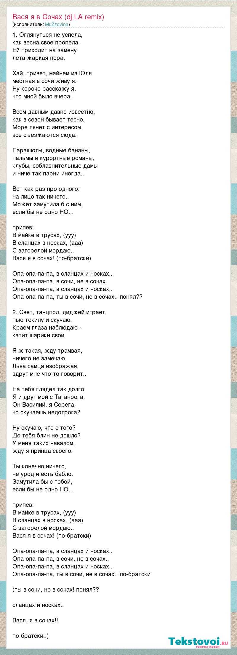 1. Оглянуться не успела, как весна свое пропела. Ей приходит на замену лета жаркая пора. Хай, привет, майнем из Юля местная в сочи живу я. Ну короче расскажу я, что мной было вчера. Всем давным давно известно, как в сезон бывает тесно. Море тянет с интересом, все съезжаются сюда. Парашюты, водные бананы, пальмы и курортные романы, клубы, соблазнительные дамы и ниче так парни иногда... Вот как раз про одного: на лицо так ничего.. Может замутила б с ним, если бы не одно НО... припев: В майке в трусах, (ууу) В сланцах в носках, (ааа) С загорелой мордаю.. Вася я в сочах! (по-братски) Опа-опа-па-па, в сланцах и носках.. Опа-опа-па-па, в сочи, не в сочах.. Опа-опа-па-па, в сланцах и носках.. Опа-опа-па-па, ты в сочи, не в сочах.. понял?? 2. Свет, танцпол, диджей играет, пью текилу и скучаю. Краем глаза наблюдаю - катит шарики свои. Я ж такая, жду трамвая, ничего не замечаю. Льва самца изображая, вдруг мне что-то говорит.. На тебя глядел так долго, Я и друг мой с Таганрога. Он Василий, я Серега, чо скучаешь недотрога? Ну скучаю, что с того? До тебя блин не дошло? У меня таких навалом, жду я принца своего. Ты конечно ничего, не урод и есть бабло. Замутила бы с тобой, если бы не одно НО... припев: В майке в трусах, (ууу) В сланцах в носках, (ааа) С загорелой мордаю.. Вася я в сочах! (по-братски) Опа-опа-па-па, в сланцах и носках.. Опа-опа-па-па, в сочи, не в сочах.. Опа-опа-па-па, в сланцах и носках.. Опа-опа-па-па, ты в сочи, не в сочах.. по-братски (ты в сочи, не в сочах! понял?? сланцах и носках.. Вася, я в сочах!! по-братски..)