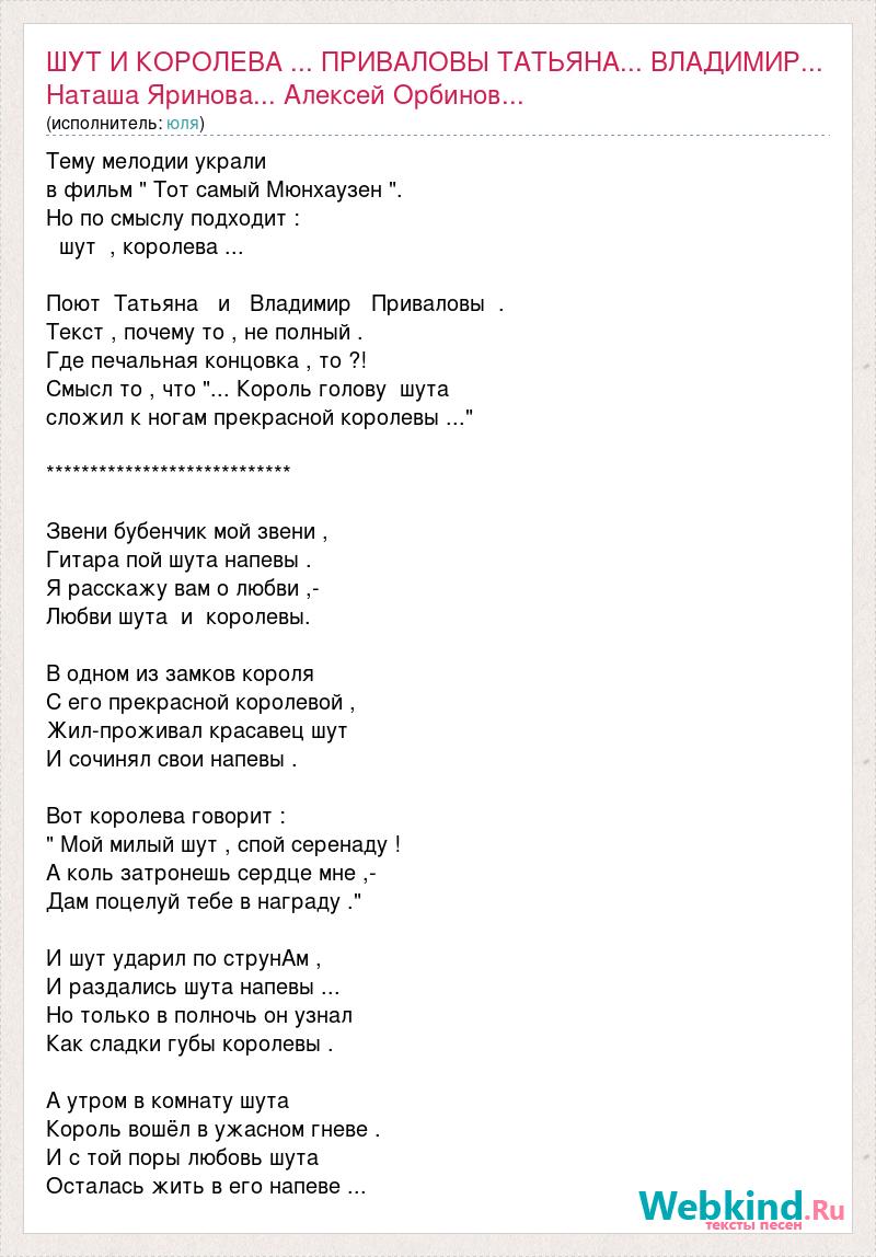Тему мелодии украли в фильм " Тот самый Мюнхаузен ". Но по смыслу подходит : шут , королева ... Поют Татьяна и Владимир Приваловы . Текст , почему то , не полный . Где печальная концовка , то ?! Смысл то , что "... Король голову шута сложил к ногам прекрасной королевы ..." **************************** Звени бубенчик мой звени , Гитара пой шута напевы . Я расскажу вам о любви ,- Любви шута и королевы. В одном из замков короля С его прекрасной королевой , Жил-проживал красавец шут И сочинял свои напевы . Вот королева говорит : " Мой милый шут , спой серенаду ! А коль затронешь сердце мне ,- Дам поцелуй тебе в награду ." И шут ударил по струнAм , И раздались шута напевы ... Но только в полночь он узнал Как сладки губы королевы . А утром в комнату шута Король вошёл в ужасном гневе . И с той поры любовь шута Осталась жить в его напеве ...