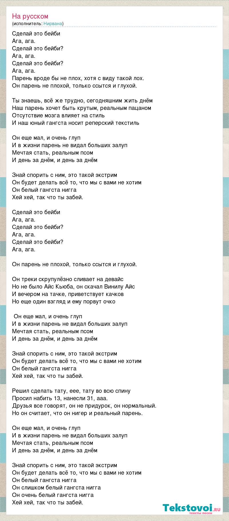 Сделай это бейби Ага, ага. Сделай это бейби? Ага, ага. Сделай это бейби? Ага, ага. Парень вроде бы не плох, хотя с виду такой лох. Он парень не плохой, только ссытся и глухой. Ты знаешь, всё же трудно, сегодняшним жить днём Наш парень хочет быть крутым, реальным пацаном Отсутствие мозга влияет на стиль И наш юный гангста носит реперский текстиль Он еще мал, и очень глуп И в жизни парень не видал больших залуп Мечтая стать, реальным псом И день за днём, и день за днём Знай спорить с ним, это такой экстрим Он будет делать всё то, что мы с вами не хотим Он белый гангста нигга Хей хей, так что ты забей. Сделай это бейби Ага, ага. Сделай это бейби? Ага, ага. Сделай это бейби? Ага, ага. Он парень не плохой, только ссытся и глухой. Он треки скрупулёзно сливает на девайс Но не было Айс Кьюба, он скачал Винилу Айс И вечером на тачке, приветствует качков Но еще один взгляд и ему порвут очко Он еще мал, и очень глуп И в жизни парень не видал больших залуп Мечтая стать, реальным псом И день за днём, и день за днём Знай спорить с ним, это такой экстрим Он будет делать всё то, что мы с вами не хотим Он белый гангста нигга Хей хей, так что ты забей. Решил сделать тату, еее, тату во всю спину Просил набить 13, нанесли 31, ааа. Друзья все говорят, он не придурок, он нормальный. Но он считает, что он нигер и реальный парень. Он еще мал, и очень глуп И в жизни парень не видал больших залуп Мечтая стать, реальным псом И день за днём, и день за днём Знай спорить с ним, это такой экстрим Он будет делать всё то, что мы с вами не хотим Он белый гангста нигга Он слишком белый гангста нигга Он очень белый гангста нигга Хей хей, так что ты забей.