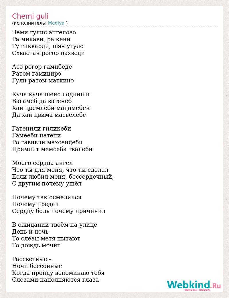 Чеми гулис ангелозо Ра микави, ра кени Ту гикварди, шэн угуло Схвастан рогор цахведи Асэ рогор гамибеде Ратом гамицирэ Гули ратом маткинэ Куча куча шенс лодинши Вагамеб да ватенеб Хан цремлеби мацамебен Да хан цвима масвелебс Гатенили гиликеби Гамееби натени Ро гавивли махсендеби Цремлит мемсеба твалеби Моего сердца ангел Что ты для меня, что ты сделал Если любил меня, бессердечный, С другим почему ушёл Почему так осмелился Почему предал Сердцу боль почему причинил В ожидании твоём на улице День и ночь То слёзы метя пытают То дождь мочит Рассветные - Ночи бессонные Когда пройду вспоминаю тебя Слезами наполняются глаза