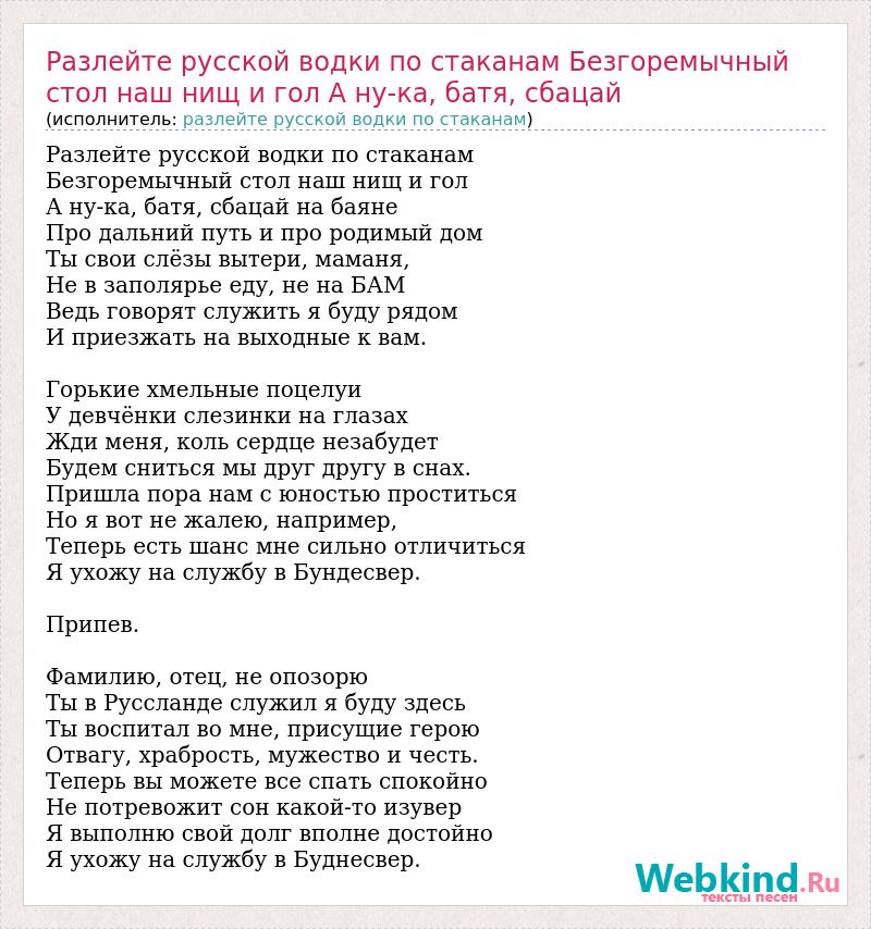 Разлейте русской водки по стаканам Безгоремычный стол наш нищ и гол А ну-ка, бат
