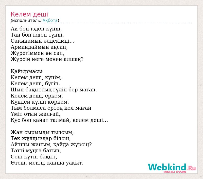 Ай боп іздеп күнді, Таң боп іздеп түнді, Сағынамын әлдекімді… Армандаймын аңсап, Жүрегіммен ән сап, Жүрсің неге менен алшақ? Қайырмасы Келем деші, күнім, Келем деші, бүгін. Шын бақыттың гүлін бер маған. Келем деші, еркем, Күндей күліп көркем. Тым болмаса ертең кел маған Үміт отын жалғай, Құс боп қанат талмай, келем деші… Жан сырымды тылсым, Тек жұлдыздар білсін, Айтшы жаным, қайда жүрсің? Тәтті мұңға батып, Сені күтіп бақыт, Өтсін, мейлі, қанша уақыт.