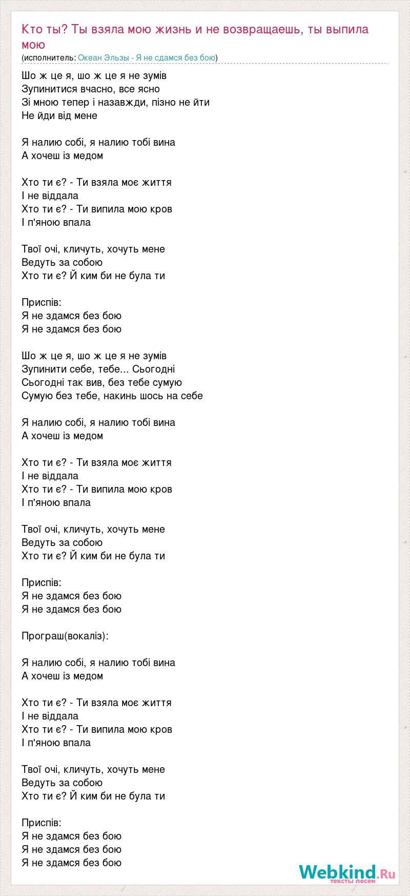 Шо ж це я, шо ж це я не зумів Зупинитися вчасно, все ясно Зі мною тепер і назавжди, пізно не йти Не йди від мене Я налию собі, я налию тобі вина А хочеш із медом Хто ти є? - Ти взяла моє життя І не віддала Хто ти є? - Ти випила мою кров І п'яною впала Твої очі, кличуть, хочуть мене Ведуть за собою Хто ти є? Й ким би не була ти Приспів: Я не здамся без бою Я не здамся без бою Шо ж це я, шо ж це я не зумів Зупинити себе, тебе... Сьогодні Сьогодні так вив, без тебе сумую Сумую без тебе, накинь шось на себе Я налию собі, я налию тобі вина А хочеш із медом Хто ти є? - Ти взяла моє життя І не віддала Хто ти є? - Ти випила мою кров І п'яною впала Твої очі, кличуть, хочуть мене Ведуть за собою Хто ти є? Й ким би не була ти Приспів: Я не здамся без бою Я не здамся без бою Програш(вокаліз): Я налию собі, я налию тобі вина А хочеш із медом Хто ти є? - Ти взяла моє життя І не віддала Хто ти є? - Ти випила мою кров І п'яною впала Твої очі, кличуть, хочуть мене Ведуть за собою Хто ти є? Й ким би не була ти Приспів: Я не здамся без бою Я не здамся без бою Я не здамся без бою