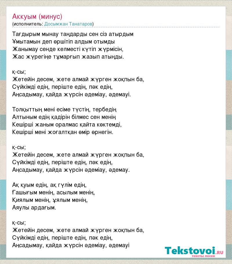 Тағдырым мынау таңдарды сен сіз атырдым Ұмытамын деп өршітіп алдым отымды Жанымау сенде келместі күтіп жүрмісін, Жас жүрегіңе тұмарғып жазып атыңды. қ-сы; Жетейін десем, жете алмай жүрген жоқпын ба, Сүйкімді едің, періште едің, пәк едің, Аңсадымау, қайда жүрсін әдеміау, әдемауі. Толқыттың мені есіме түстің, тербедің Алтыным едің қадірін білмес сен менің Кешірші жаным оралмас қайта көктемді, Кешірші мені жоғалтқан өмір өрнегін. қ-сы; Жетейін десем, жете алмай жүрген жоқпын ба, Сүйкімді едің, періште едің, пәк едің, Аңсадымау, қайда жүрсін әдеміау, әдемау. Ақ қуым едің, ақ гүлім едің, Ғашығым менің, асылым менің, Қиялым менің, ұялым менің, Аяулы ардағым. қ-сы; Жетейін десем, жете алмай жүрген жоқпын ба, Сүйкімді едің, періште едің, пәк едің, Аңсадымау, қайда жүрсін әдеміау, әдемауі