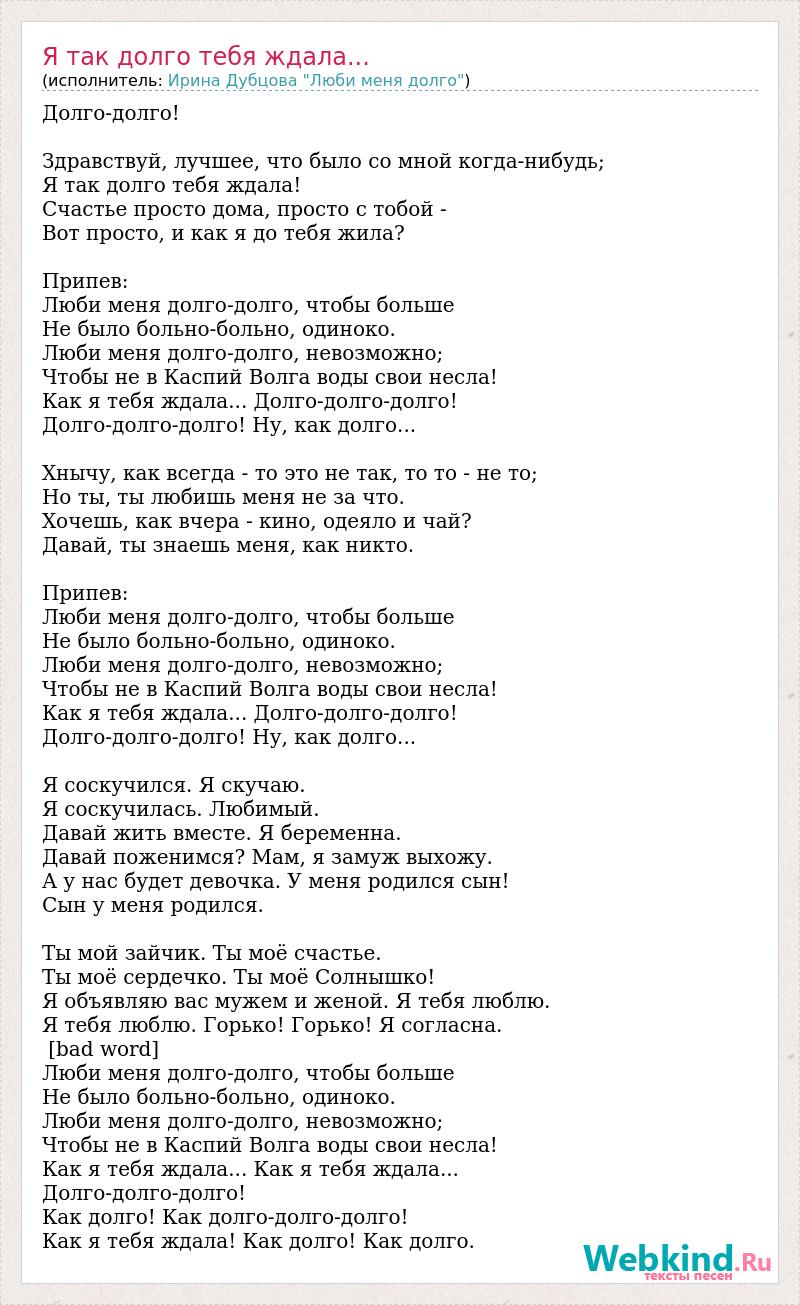 Долго-долго! Здравствуй, лучшее, что было со мной когда-нибудь; Я так долго тебя ждала! Счастье просто дома, просто с тобой - Вот просто, и как я до тебя жила? Припев: Люби меня долго-долго, чтобы больше Не было больно-больно, одиноко. Люби меня долго-долго, невозможно; Чтобы не в Каспий Волга воды свои несла! Как я тебя ждала... Долго-долго-долго! Долго-долго-долго! Ну, как долго... Хнычу, как всегда - то это не так, то то - не то; Но ты, ты любишь меня не за что. Хочешь, как вчера - кино, одеяло и чай? Давай, ты знаешь меня, как никто. Припев: Люби меня долго-долго, чтобы больше Не было больно-больно, одиноко. Люби меня долго-долго, невозможно; Чтобы не в Каспий Волга воды свои несла! Как я тебя ждала... Долго-долго-долго! Долго-долго-долго! Ну, как долго... Я соскучился. Я скучаю. Я соскучилась. Любимый. Давай жить вместе. Я беременна. Давай поженимся? Мам, я замуж выхожу. А у нас будет девочка. У меня родился сын! Сын у меня родился. Ты мой зайчик. Ты моё счастье. Ты моё сердечко. Ты моё Солнышко! Я объявляю вас мужем и женой. Я тебя люблю. Я тебя люблю. Горько! Горько! Я согласна. [bad word] Люби меня долго-долго, чтобы больше Не было больно-больно, одиноко. Люби меня долго-долго, невозможно; Чтобы не в Каспий Волга воды свои несла! Как я тебя ждала... Как я тебя ждала... Долго-долго-долго! Как долго! Как долго-долго-долго! Как я тебя ждала! Как долго! Как долго.