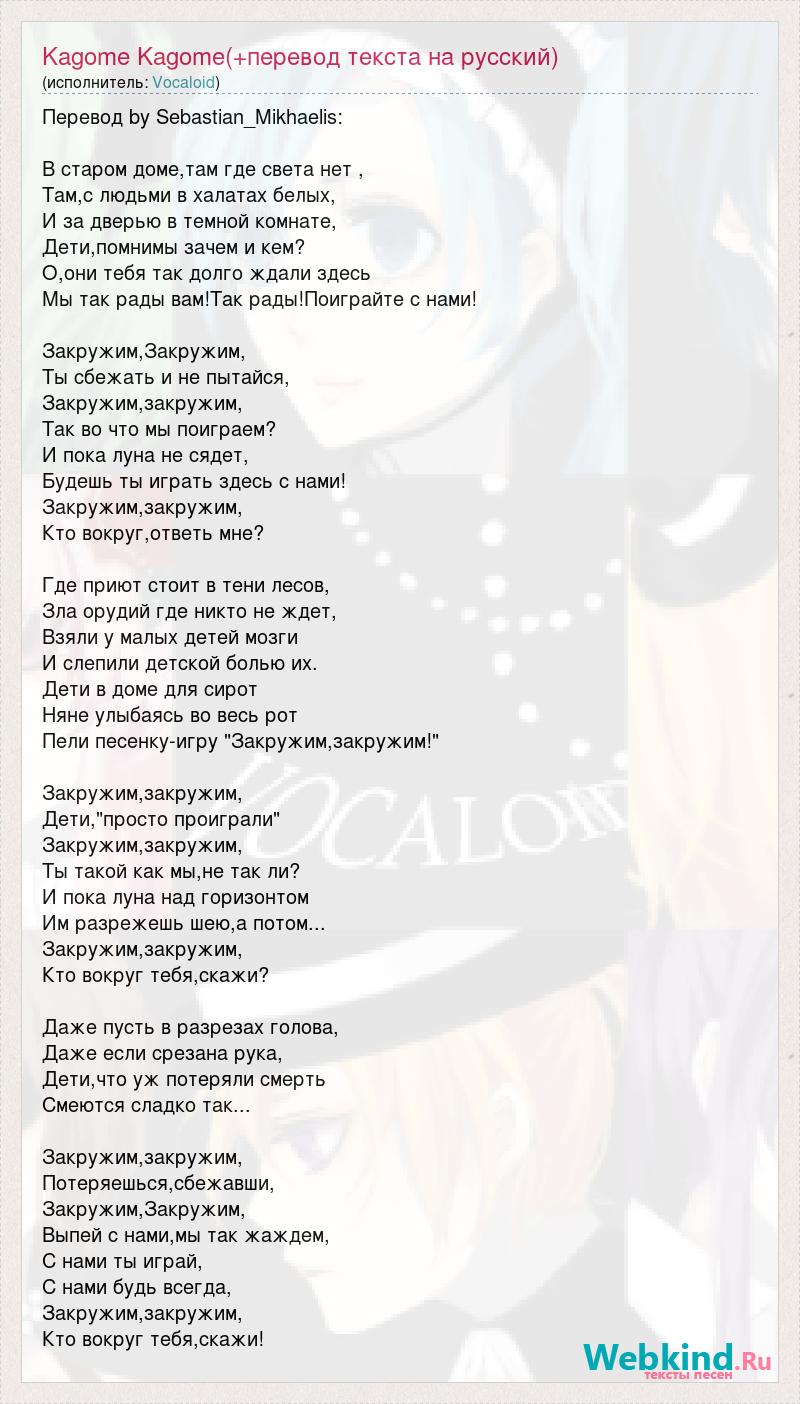 Перевод by Sebastian_Mikhaelis: В старом доме,там где света нет , Там,с людьми в халатах белых, И за дверью в темной комнате, Дети,помнимы зачем и кем? О,они тебя так долго ждали здесь Мы так рады вам!Так рады!Поиграйте с нами! Закружим,Закружим, Ты сбежать и не пытайся, Закружим,закружим, Так во что мы поиграем? И пока луна не сядет, Будешь ты играть здесь с нами! Закружим,закружим, Кто вокруг,ответь мне? Где приют стоит в тени лесов, Зла орудий где никто не ждет, Взяли у малых детей мозги И слепили детской болью их. Дети в доме для сирот Няне улыбаясь во весь рот Пели песенку-игру "Закружим,закружим!" Закружим,закружим, Дети,"просто проиграли" Закружим,закружим, Ты такой как мы,не так ли? И пока луна над горизонтом Им разрежешь шею,а потом... Закружим,закружим, Кто вокруг тебя,скажи? Даже пусть в разрезах голова, Даже если срезана рука, Дети,что уж потеряли смерть Смеются сладко так... Закружим,закружим, Потеряешься,сбежавши, Закружим,Закружим, Выпей с нами,мы так жаждем, С нами ты играй, С нами будь всегда, Закружим,закружим, Кто вокруг тебя,скажи!