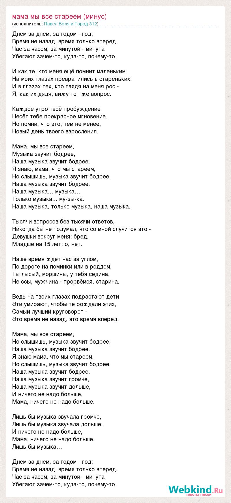 Днем за днем, за годом - год; Время не назад, время только вперед. Час за часом, за минутой - минута Убегают зачем-то, куда-то, почему-то. И как те, кто меня ещё помнит маленьким На моих глазах превратились в стареньких. И в глазах тех, кто глядя на меня рос - Я, как их дядя, вижу тот же вопрос. Каждое утро твоё пробуждение Несёт тебе прекрасное мгновение. Но помни, что это, тем не менее, Новый день твоего взросления. Мама, мы все стареем, Музыка звучит бодрее, Наша музыка звучит бодрее. Я знаю, мама, что мы стареем, Но слышишь, музыка звучит бодрее, Наша музыка звучит бодрее. Наша музыка… музыка… Только музыка... му-зы-ка. Наша музыка, только музыка, наша музыка. Тысячи вопросов без тысячи ответов, Никогда бы не подумал, что со мной случится это - Девушки вокруг меня: бред, Младше на 15 лет: о, нет. Наше время ждёт нас за углом, По дороге на поминки или в роддом, Ты лысый, морщины, у тебя седина. Не ссы, мужчина - прорвёмся, старина. Ведь на твоих глазах подрастают дети Эти умирают, чтобы те рождали этих, Самый лучший круговорот - Это время не назад, это время вперёд. Мама, мы все стареем, Но слышишь, музыка звучит бодрее, Наша музыка звучит бодрее. Я знаю мама, что мы стареем. Но слышишь, музыка звучит бодрее, Наша музыка звучит бодрее. Наша музыка звучит громче, Наша музыка звучит дольше, И ничего не надо больше, Мама, ничего не надо больше. Лишь бы музыка звучала громче, Лишь бы музыка звучала дольше, И ничего не надо больше, Мама, ничего не надо больше. Лишь бы музыка… Днем за днем, за годом - год; Время не назад, время только вперед. Час за часом, за минутой - минута Убегают зачем-то, куда-то, почему-то.