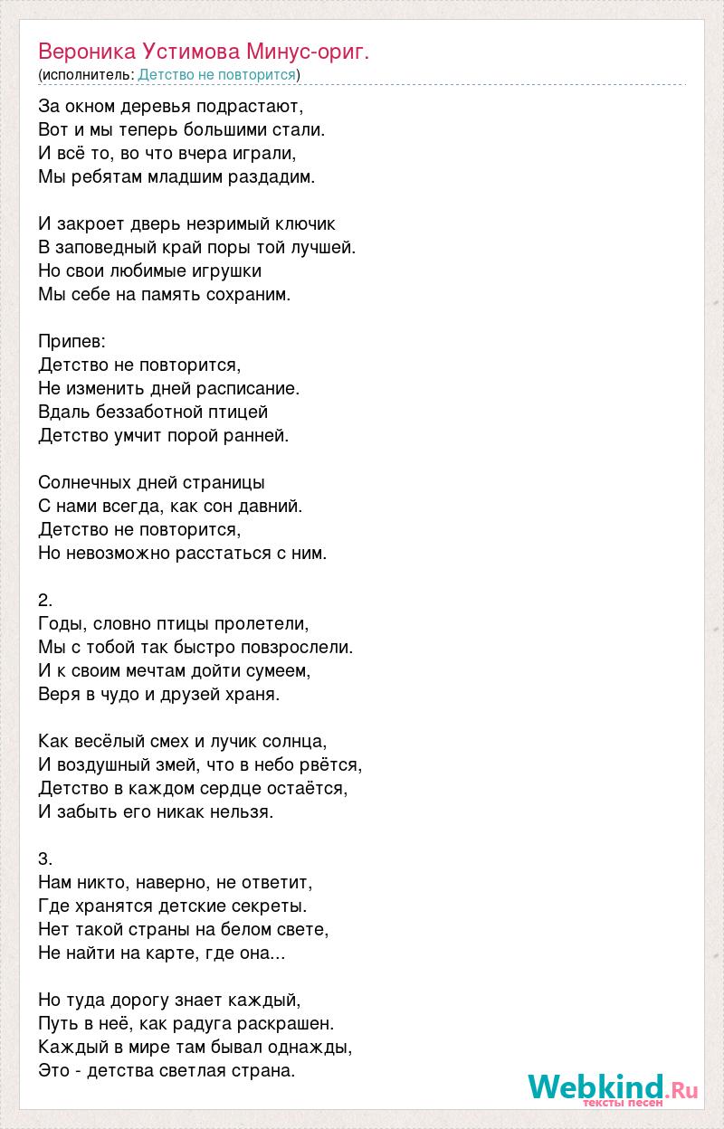 За окном деревья подрастают, Вот и мы теперь большими стали. И всё то, во что вчера играли, Мы ребятам младшим раздадим. И закроет дверь незримый ключик В заповедный край поры той лучшей. Но свои любимые игрушки Мы себе на память сохраним. Припев: Детство не повторится, Не изменить дней расписание. Вдаль беззаботной птицей Детство умчит порой ранней. Солнечных дней страницы С нами всегда, как сон давний. Детство не повторится, Но невозможно расстаться с ним. 2. Годы, словно птицы пролетели, Мы с тобой так быстро повзрослели. И к своим мечтам дойти сумеем, Веря в чудо и друзей храня. Как весёлый смех и лучик солнца, И воздушный змей, что в небо рвётся, Детство в каждом сердце остаётся, И забыть его никак нельзя. 3. Нам никто, наверно, не ответит, Где хранятся детские секреты. Нет такой страны на белом свете, Не найти на карте, где она... Но туда дорогу знает каждый, Путь в неё, как радуга раскрашен. Каждый в мире там бывал однажды, Это - детства светлая страна.