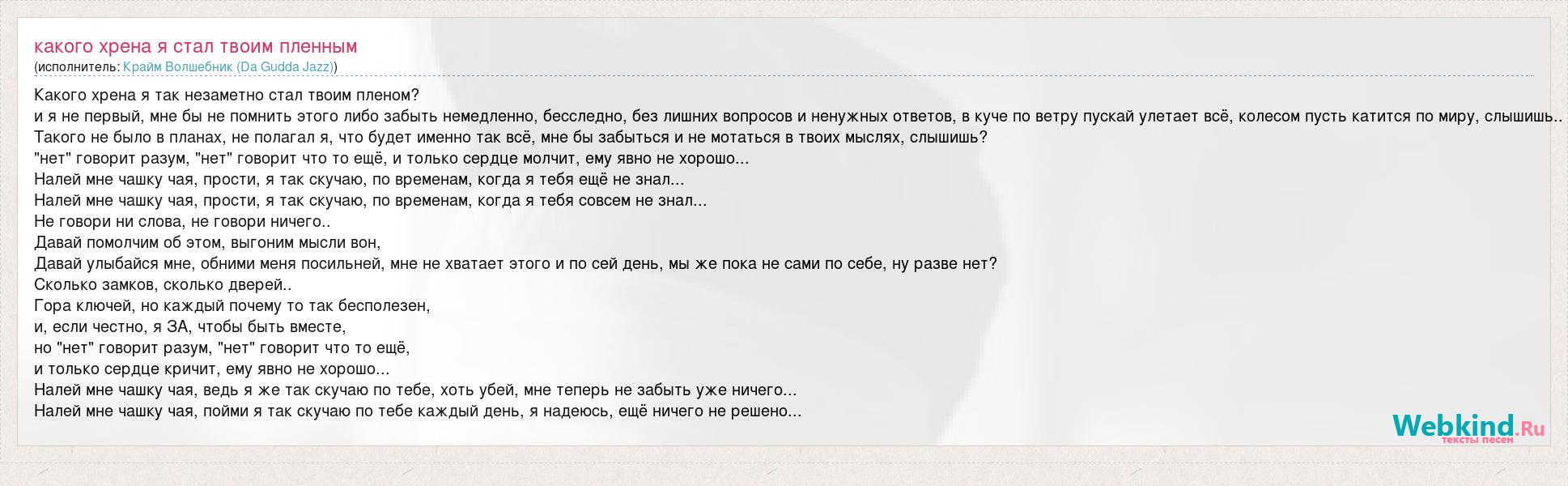 Какого хрена я так незаметно стал твоим пленом? и я не первый, мне бы не помнить этого либо забыть немедленно, бесследно, без лишних вопросов и ненужных ответов, в куче по ветру пускай улетает всё, колесом пусть катится по миру, слышишь.. Такого не было в планах, не полагал я, что будет именно так всё, мне бы забыться и не мотаться в твоих мыслях, слышишь? "нет" говорит разум, "нет" говорит что то ещё, и только сердце молчит, ему явно не хорошо... Налей мне чашку чая, прости, я так скучаю, по временам, когда я тебя ещё не знал... Налей мне чашку чая, прости, я так скучаю, по временам, когда я тебя совсем не знал... Не говори ни слова, не говори ничего.. Давай помолчим об этом, выгоним мысли вон, Давай улыбайся мне, обними меня посильней, мне не хватает этого и по сей день, мы же пока не сами по себе, ну разве нет? Сколько замков, сколько дверей.. Гора ключей, но каждый почему то так бесполезен, и, если честно, я ЗА, чтобы быть вместе, но "нет" говорит разум, "нет" говорит что то ещё, и только сердце кричит, ему явно не хорошо... Налей мне чашку чая, ведь я же так скучаю по тебе, хоть убей, мне теперь не забыть уже ничего... Налей мне чашку чая, пойми я так скучаю по тебе каждый день, я надеюсь, ещё ничего не решено...