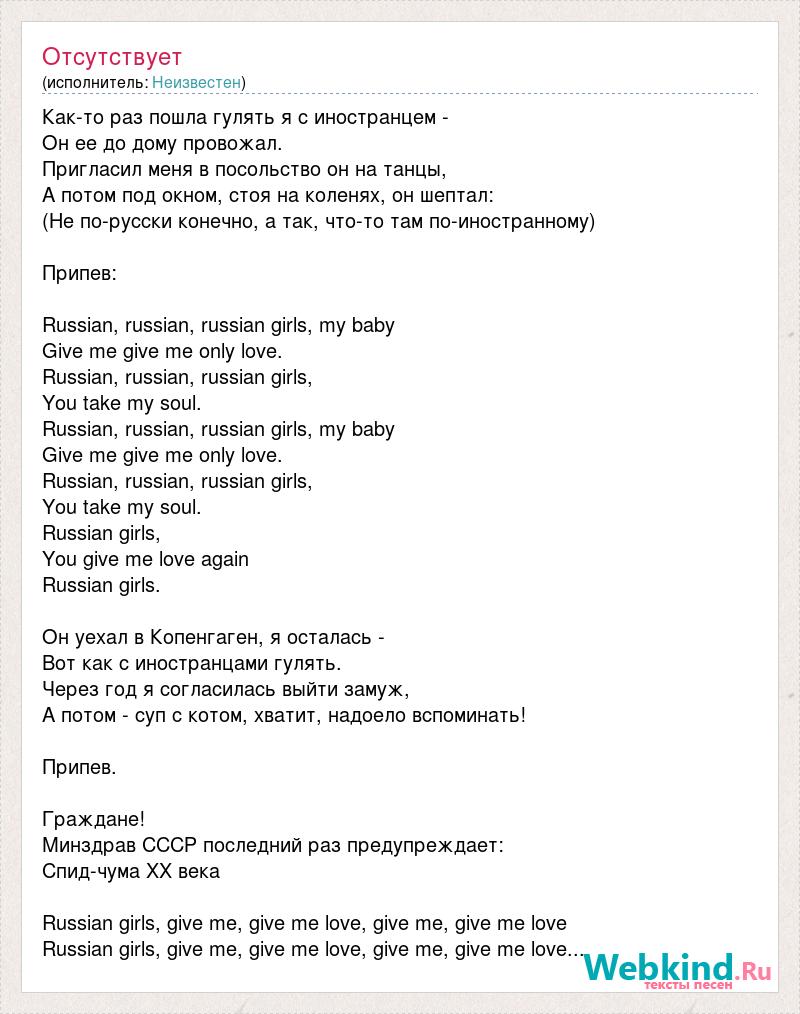 Как-то раз пошла гулять я с иностранцем - Он ее до дому провожал. Пригласил меня в посольство он на танцы, А потом под окном, стоя на коленях, он шептал: (Не по-русски конечно, а так, что-то там по-иностранному) Припев: Russian, russian, russian girls, my baby Give me give me only love. Russian, russian, russian girls, You take my soul. Russian, russian, russian girls, my baby Give me give me only love. Russian, russian, russian girls, You take my soul. Russian girls, You give me love again Russian girls. Он уехал в Копенгаген, я осталась - Вот как с иностранцами гулять. Через год я согласилась выйти замуж, А потом - суп с котом, хватит, надоело вспоминать! Припев. Граждане! Минздрав СССР последний раз предупреждает: Спид-чума ХХ века Russian girls, give me, give me love, give me, give me love Russian girls, give me, give me love, give me, give me love...