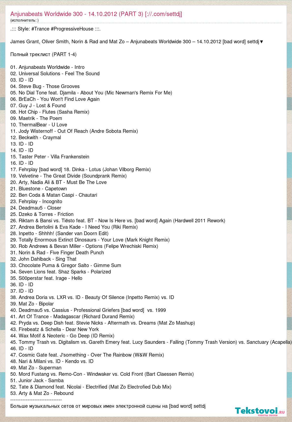 .::: Style: #Trance #ProgressiveHouse :::. James Grant, Oliver Smith, Norin & Rad and Mat Zo – Anjunabeats Worldwide 300 – 14.10.2012 [bad word] settdj▼ Полный треклист (PART 1-4) 01. Anjunabeats Worldwide - Intro 02. Universal Solutions - Feel The Sound 03. ID - ID 04. Steve Bug - Those Grooves 05. No Dial Tone feat. Djamila - About You (Mic Newman's Remix For Me) 06. BrEaCh - You Won't Find Love Again 07. Guy J - Lost & Found 08. Hot Chip - Flutes (Sasha Remix) 09. Maetrik - The Poem 10. ThermalBear - U Love 11. Jody Wisternoff - Out Of Reach (Andre Sobota Remix) 12. Beckwith - Craymal 13. ID - ID 14. ID - ID 15. Taster Peter - Villa Frankenstein 16. ID - ID 17. Fehrplay - Runaway 18. Dinka - Lotus (Johan Vilborg Remix) 19. Velvetine - The Great Divide (Soundprank Remix) 20. Arty, Nadia Ali & BT - Must Be The Love 21. Bluestone - Capetown 22. Ben Coda & Matan Caspi - Chautari 23. Fehrplay - Incognito 24. Deadmau5 - Closer 25. Dzeko & Torres - Friction 26. Riktam & Bansi vs. Tiësto feat. BT - Now Is Here vs. Love Comes Again (Hardwell 2011 Rework) 27. Andrea Bertolini & Eva Kade - I Need You (Riki Remix) 28. Inpetto - Shhhh! (Sander van Doorn Edit) 29. Totally Enormous Extinct Dinosaurs - Your Love (Mark Knight Remix) 30. Rob Andrews & Bevan Miller - Options (Felipe Wrechiski Remix) 31. Norin & Rad - Five Finger Death Punch 32. John Dahlback - Sing That 33. Chocolate Puma & Gregor Salto - Gimme Sum 34. Seven Lions feat. Shaz Sparks - Polarized 35. S00perstar feat. Irage - Hello 36. ID - ID 37. ID - ID 38. Andrea Doria vs. LXR vs. ID - Beauty Of Silence (Inpetto Remix) vs. ID 39. Mat Zo - Bipolar 40. Deadmau5 vs. Cassius - Professional Griefers (Instrumental) vs. 1999 41. Art Of Trance - Madagascar (Richard Durand Remix) 42. Pryda vs. Deep Dish feat. Stevie Nicks - Aftermath vs. Dreams (Mat Zo Mashup) 43. Firebeatz & Schella - Dear New York 44. Wax Motif & Neoteric - Go Deep (ID Remix) 45. Tommy Trash vs. Digitalism vs. Gareth Emery feat. Lucy Saunders - Falling (Tommy Trash Version) vs. Sanctuary (Acapella) 46. ID - ID 47. Cosmic Gate feat. J'something - Over The Rainbow (W&W Remix) 48. Nari & Milani vs. ID - Kendo vs. ID 49. Mat Zo - Superman 50. Mord Fustang vs. Remo-Con - Windwaker vs. Cold Front (Bart Claessen Remix) 51. Junior Jack - Samba 52. Tate & Diamond feat. Nicolai - Electrified (Mat Zo Electrofied Dub Mix) 53. Arty & Mat Zo - Rebound ------------------------------ Больше музыкальных сетов от мировых имен электронной сцены на [bad word] settdj