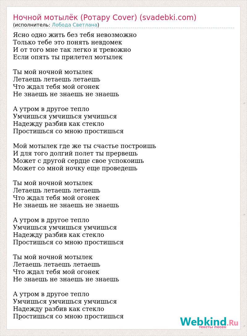 Ясно одно жить без тебя невозможно Только тебе это понять невдомек И от того мне так легко и тревожно Если опять ты прилетел мотылек Ты мой ночной мотылек Летаешь летаешь летаешь Что ждал тебя мой огонек Не знаешь не знаешь не знаешь А утром в другое тепло Умчишься умчишься умчишься Надежду разбив как стекло Простишься со мною простишься Мой мотылек где же ты счастье построишь И для того долгий полет ты прервешь Может с другой сердце свое успокоишь Может со мной ночку еще проведешь Ты мой ночной мотылек Летаешь летаешь летаешь Что ждал тебя мой огонек Не знаешь не знаешь не знаешь А утром в другое тепло Умчишься умчишься умчишься Надежду разбив как стекло Простишься со мною простишься Ты мой ночной мотылек Летаешь летаешь летаешь Что ждал тебя мой огонек Не знаешь не знаешь не знаешь А утром в другое тепло Умчишься умчишься умчишься Надежду разбив как стекло Простишься со мною простишься