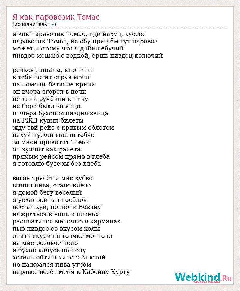 я как паравозик Томас, иди нахуй, хуесос паравозик Томас, не ебу при чём тут паравоз может, потому что я дибил ебучий пивдос мешаю с водкой, ершь пиздец колючий рельсы, шпалы, кирпичи в тебя летит струя мочи на помощь батю не кричи он вчера сгорел в печи не тяни ручёнки к пиву не бери быка за яйца я вчера бухой отпиздил зайца на РЖД купил билеты жду свй рейс с кривым еблетом нахуй нужен ваш автобус за мной прикатит Томас он хуячит как ракета прямым рейсом прямо в глеба я готовлю бутеры без хлеба вагон трясёт и мне хуёво выпил пива, стало клёво я домой бегу весёлый я уехал жить в посёлок достал хуй, пошёл к Вовану нажраться в наших планах расплатился мелочью в карманах пью пивдос со вкусом колы опять скурил в толчке монгола на мне розовое поло я бухой качусь по полу хотел пойти в кино с Анютой но нажрался пива утром паравоз везёт меня к Кабейну Курту