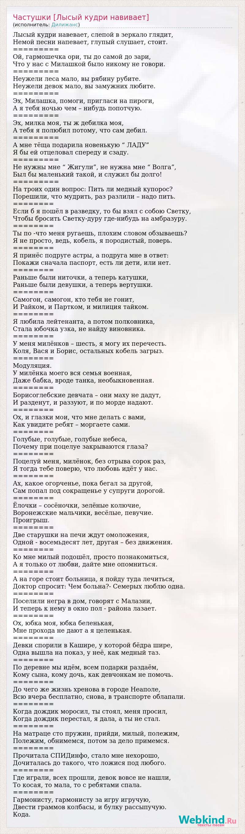 Лысый кудри навевает, слепой в зеркало глядит, Немой песни напевает, глупый слушает, стоит. ========= Ой, гармошечка ори, ты до самой до зари, Что у нас с Милашкой было никому не говори. ========= Неужели леса мало, вы рябину рубите. Неужели девок мало, вы замужних любите. ========= Эх, Милашка, помоги, пригласи на пироги, А я тебя ночью чем – нибудь попотчую. ========= Эх, милка моя, ты ж дебилка моя, А тебя я полюбил потому, что сам дебил. ========= А мне тёща подарила новенькую “ ЛАДУ” Я бы ей отцеловал спереду и сзаду. ========= Не нужны мне “ Жигули”, не нужна мне “ Волга”, Был бы маленький такой, и служил бы долго! ========= На троих один вопрос: Пить ли медный купорос? Порешили, что мудрить, раз разлили – надо пить. ======== Если б я пошёл в разведку, то бы взял с собою Светку, Чтобы бросить Светку-дуру где-нибудь на амбразуру. ======== Ты по -что меня ругаешь, плохим словом обзываешь? Я не просто, ведь, кобель, я породистый, поверь. ======== Я принёс подруге астры, а подруга мне в ответ: Покажи сначала паспорт, есть ли дети, или нет. ======== Раньше были ниточки, а теперь катушки, Раньше были девушки, а теперь вертушки. ======== Самогон, самогон, кто тебя не гонит, И Райком, и Партком, и милиция тайком. ======== Я любила лейтенанта, а потом полковника, Стала юбочка узка, не найду виновника. ======== У меня милёнков – шесть, я могу их перечесть. Коля, Вася и Борис, остальных кобель загрыз. ======== Модуляция. У милёнка моего вся семья военная, Даже бабка, вроде танка, необыкновенная. ======== Борисоглебские девчата – они маху не дадут, И разденут, и раззуют, и по морде надают. ======== Ох, и глазки мои, что мне делать с вами, Как увидите ребят – моргаете сами. ======== Голубые, голубые, голубые небеса, Почему при поцелуе закрываются глаза? ======== Поцелуй меня, милёнок, без отрыва сорок раз, Я тогда тебе поверю, что любовь идёт у нас. ======== Ах, какое огорченье, пока бегал за другой, Сам попал под сокращенье у супруги дорогой. ======== Ёлочки – сосёночки, зелёные колючие, Воронежские мальчики, весёлые, певучие. Проигрыш. ======== Две старушки на печи ждут омоложения, Одной - восемьдесят лет, другая – без движения. ======== Ко мне милый подошёл, просто познакомиться, А я только от любви, дайте мне опомниться. ======== А на горе стоит больница, я пойду туда лечиться, Доктор спросит: Чем больна?- Семерых люблю одна. ======== Поселили негра в дом, говорят с Малазии, И теперь к нему в окно пол - района лазает. ======== Ох, юбка моя, юбка беленькая, Мне прохода не дают а я целенькая. ======== Девки спорили в Кашире, у которой бёдра шире, Одна вышла на показ, у неё, как медный таз. ======== По деревне мы идём, всем подарки раздаём, Кому сына, кому дочь, как девчонкам не помочь. ======== До чего же жизнь хренова в городе Неаполе, Всю вчера бесплатно, снова, в транспорте облапали. ======== Когда дождик моросил, ты стоял, меня просил, Когда дождик перестал, я дала, а ты не стал. ======== На матраце сто пружин, прийди, милый, полежим, Полежим, обнимемся, потом за дело примемся. ======== Прочитала СПИДинфо, стало мне нехорошо, Дочиталась до такого, что ложися под любого. ======== Где играли, всех прошли, девок вовсе не нашли, То косая, то мала, то с ребятами спала. ======== Гармонисту, гармонисту за игру игручую, Двести граммов колбасы, и булку рассыпучую. Кода.